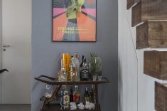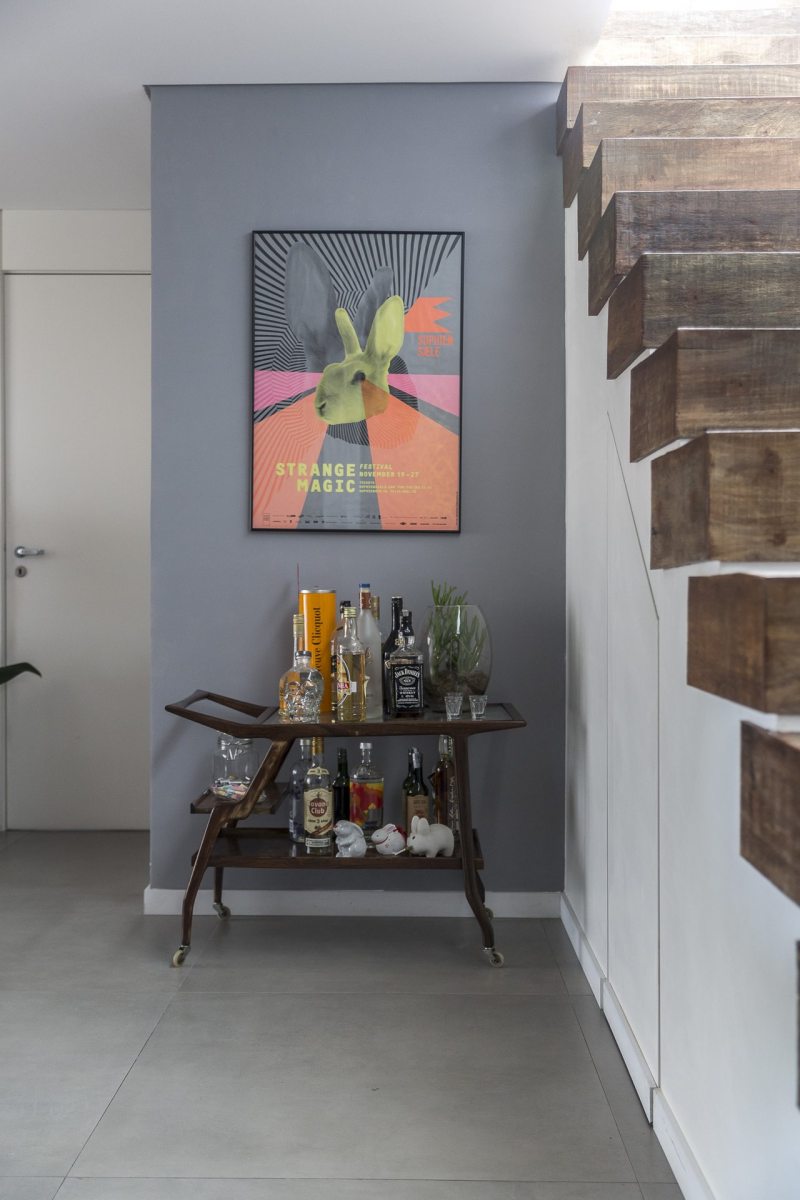No cantinho próximo à escada do apto, o carrinho herdado da avó, e desenhado pelo designer Jean Gillon, ganhou uma nova função: virou o bar da casa | Projeto do escritório Korman Arquitetos | Foto: JPImage