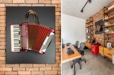 Para eternizar a memória afetiva, a sanfona de um antepassado foi posta exposta como um quadro na parede de tijolinhos aparentes que integra o projeto de um loft | Projeto do escritório Korman Arquitetos | Foto: Eduardo Pozella