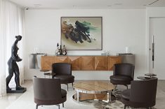 Decorar com peças únicas e autênticas entrega uma alma especial aos espaços e, nessa sala de estar, o destaque se direciona para a escultura de bronze patinado, de Sonia Ebling, e ao fundo, a tela de Tikashi Fukushima atrai olhares curiosos | Projeto do escritório Korman Arquitetos | Foto: Gui Morelli