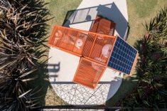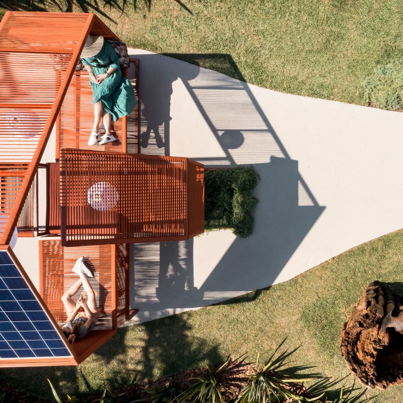 O design, clean e geométrico, se adapta aos mais diferentes usos. A versatilidade da peça permite o uso como casinha infantil, área para trabalho ou até mesmo uma estufa de plantas. O próprio móvel convida à interação, seja para sentar, deitar, ler ou conversar. Fabricado em estrutura metálica com revestimento em corda náutica, a House conta com uma placa fotovoltaica que utiliza radiação solar para gerar eletricidade. Sustentável, a peça é uma fonte de energia renovável e limpa para carregar aparelhos eletrônicos.