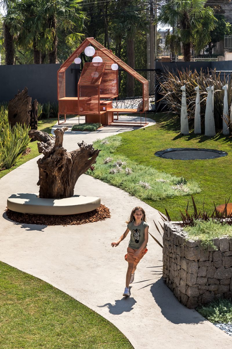 Um quintal também pede um cantinho especial para as crianças. Especializadas em projetos de educação infantil, Roberta e Daniela desenvolveram um espaço exclusivo para os pequenos. Eles podem se divertir nos balanços coloridos ou na cama elástica, quase camuflada na grama. Além do passeio, toda a experiência também pode ser contemplada por bancos e estruturas arquitetônicas esculturais.