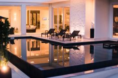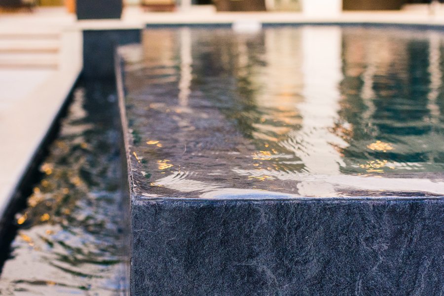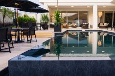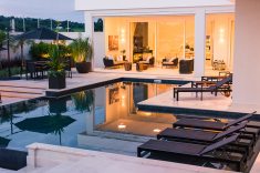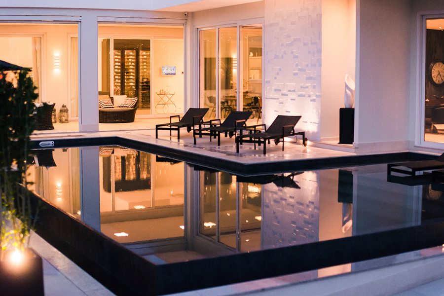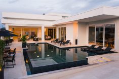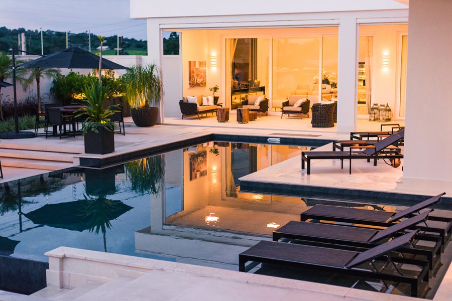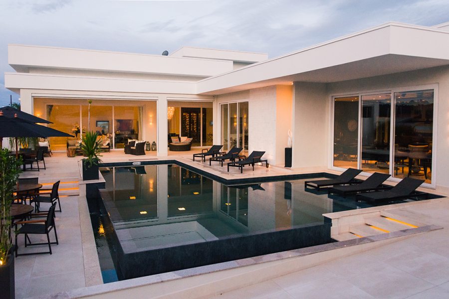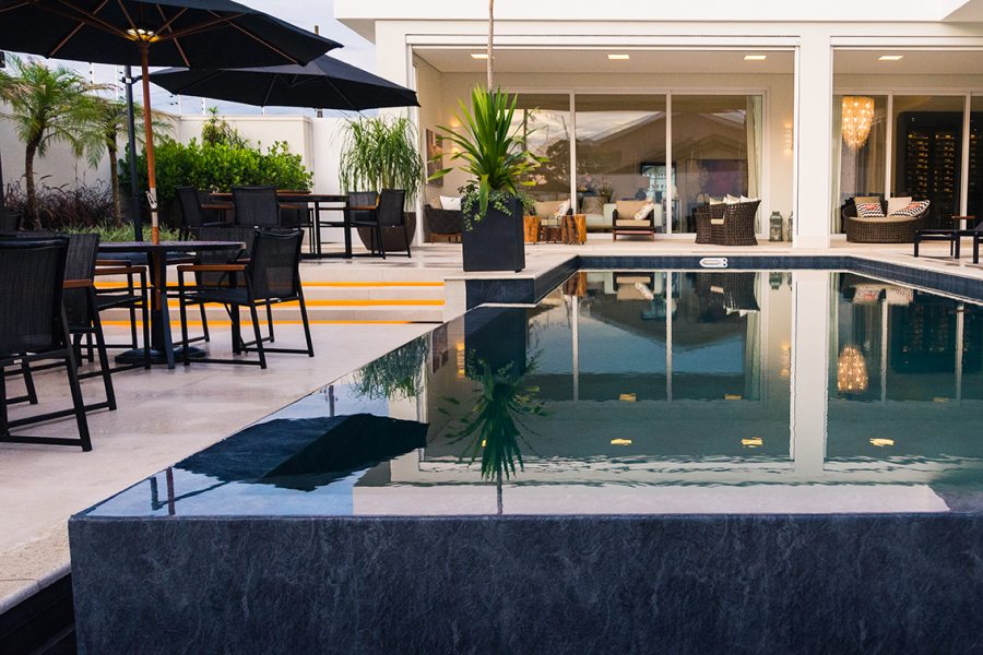 Com 735 m2, a casa ganhou piscina de 70 m2 com borda infinita em placa cimentícia atérmica na cor Travertino, da Desjoyaux Piscinas, e revestimento Desjoyaux Touch Elegance. “Optamos pela Desjoyaux pela facilidade de manutenção, pois o sistema dispensa casa de máquinas, registros e tubulações, tornando a piscina imune a vazamentos. Além disso, o sistema Desjoyaux proporciona uma qualidade de água sete vezes superior ao sistema convencional, com gasto de energia 75% menor, por dispensar a retrolavagem e por possuir sistema de circulação de água inteligente. É o sistema de filtração mais eficiente e inteligente do mundo”, elogiam as profissionais.