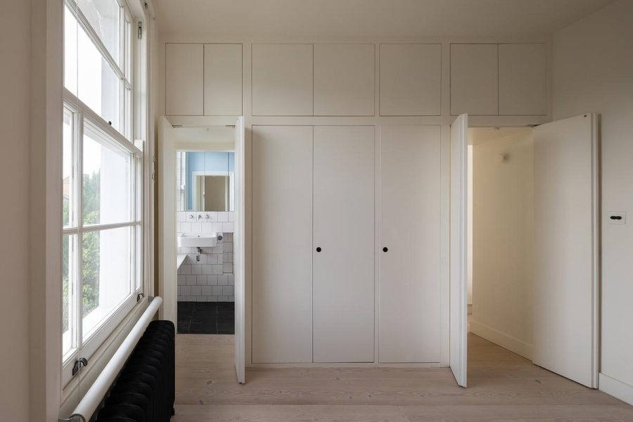 A segunda proposta está no quarto, estruturado por uma parede contínua de armários. Além de organizar roupas e objetos, o painel integra duas portas camufladas no desenho da marcenaria. Uma leva ao banheiro; a outra, ao escritório. Quando fechadas, desaparecem na composição, mantendo a leitura limpa do espaço. Ao abrir, revelam a circulação interna sem fragmentar o ambiente.