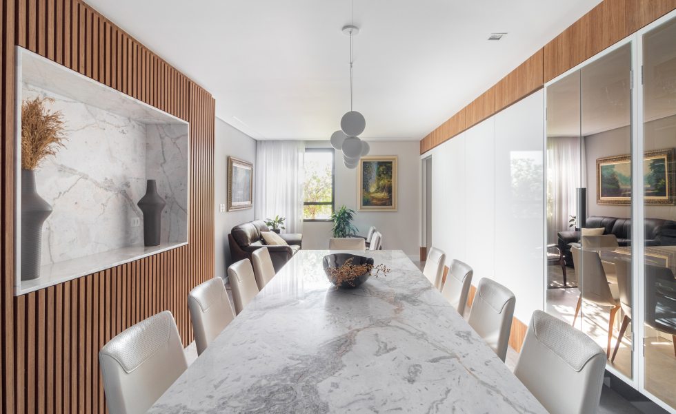 A impactante sala de jantar, protagonizada pela mesa de mármore branco Paraná da Inove design e pelo mobiliário sob medida, em carvalho Hannover, impressiona visitantes desde a porta de entrada. A composição da madeira e do mármore marca presença também na parede de fundo, que pode ser utilizada como buffet ou nicho decorativo, e no armário espelhado, que funciona como cristaleira e porta de acesso à cozinha. O mobiliário de design clean da Inove Design e o piso de porcelanato marmorizado da Portobello Shop Alto da XV, contrasta com os estofados de couro e os revestimentos amadeirados do estar íntimo.