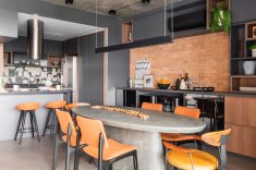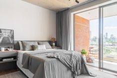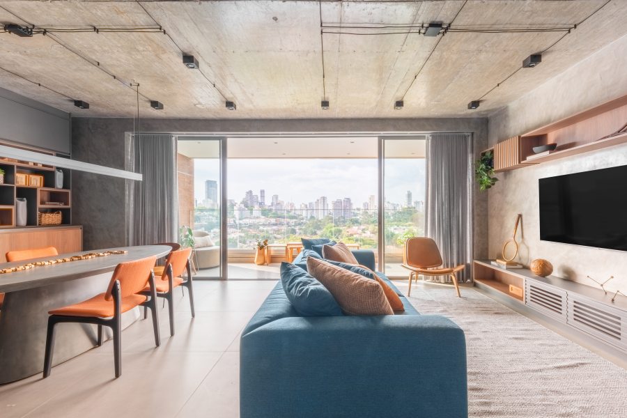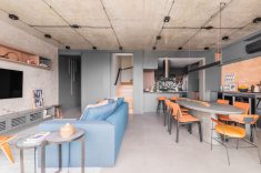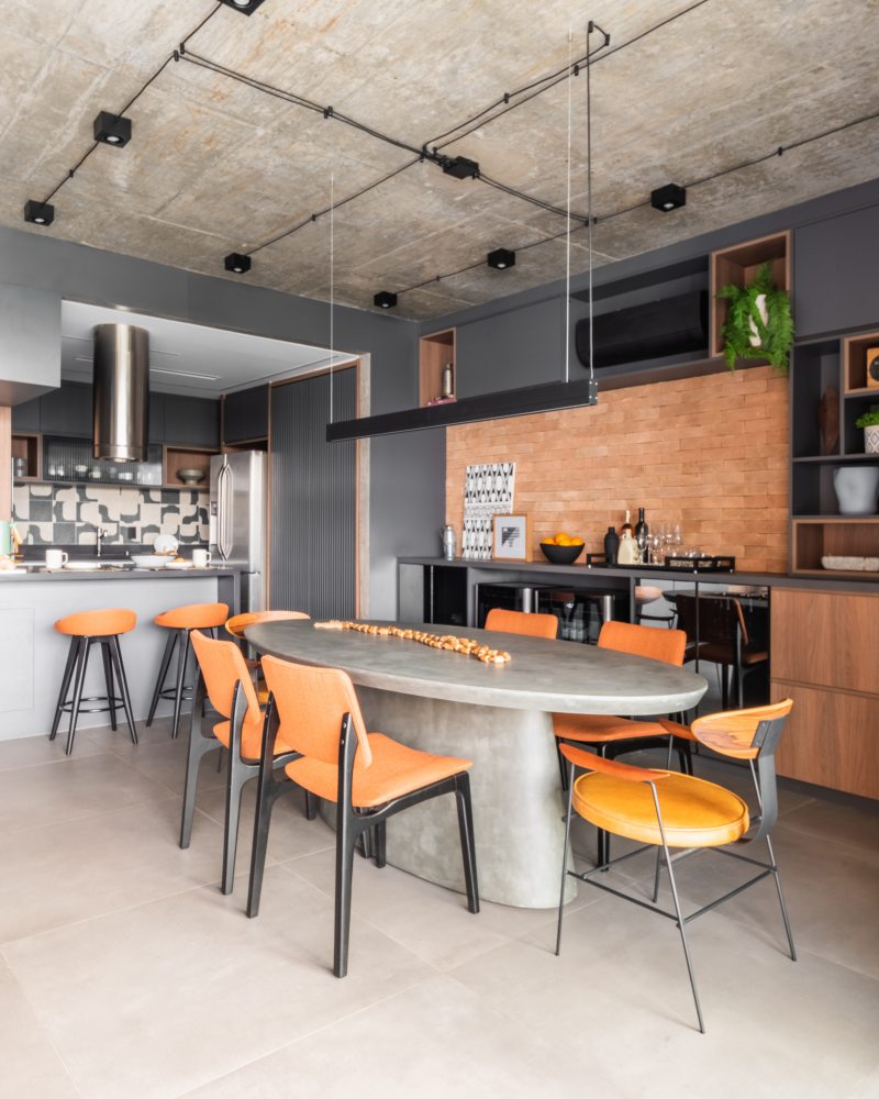 Características do estilo industrial moderno como objetos metálicos, a estética do cimento queimado e cabos aparentes no teto são marcantes e presentes nos aptos dos irmãos. Além disso, o estilo original exaltou a brasilidade e a calmaria dos ambientes. | Fotos: Guilherme Pucci