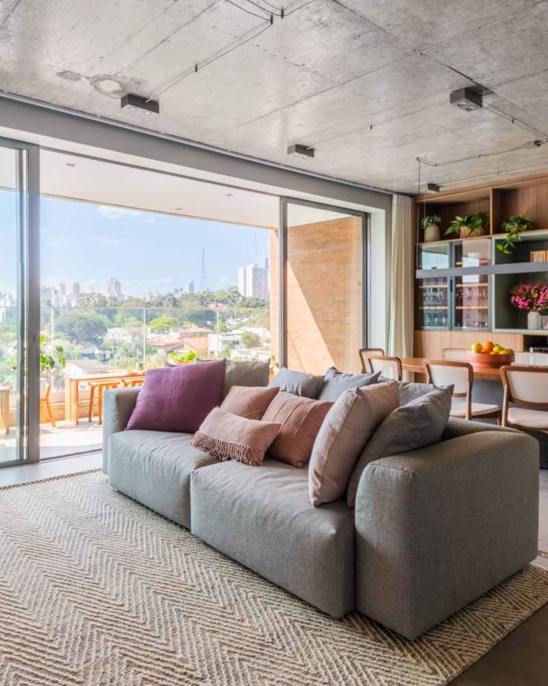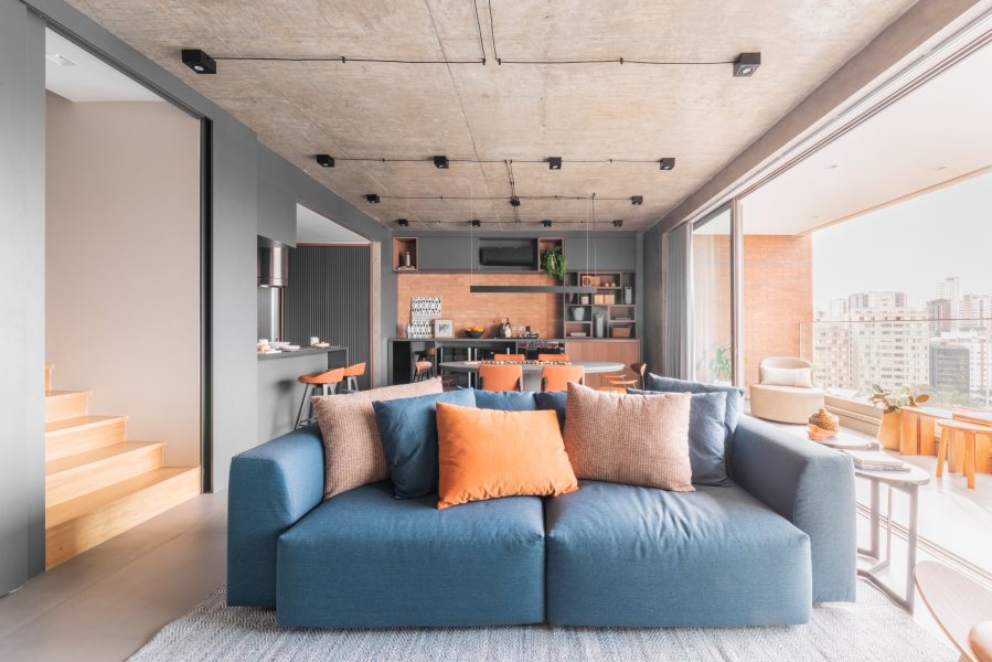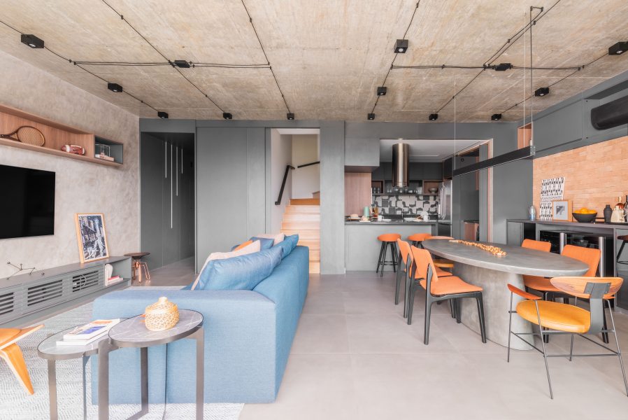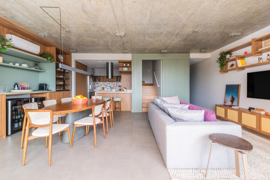 Em apartamentos integrados, como esses, é importante pensar em soluções para demarcar espaços e garantir a privacidade. Ao assumir o projeto de reforma o arquiteto constatou que a planta original já incluía um pavimento térreo com layout amplo e integrado; com isso, a reforma priorizou a manutenção deste "ar de estúdio" e valorizou a atmosfera fluida e flexível da área social.