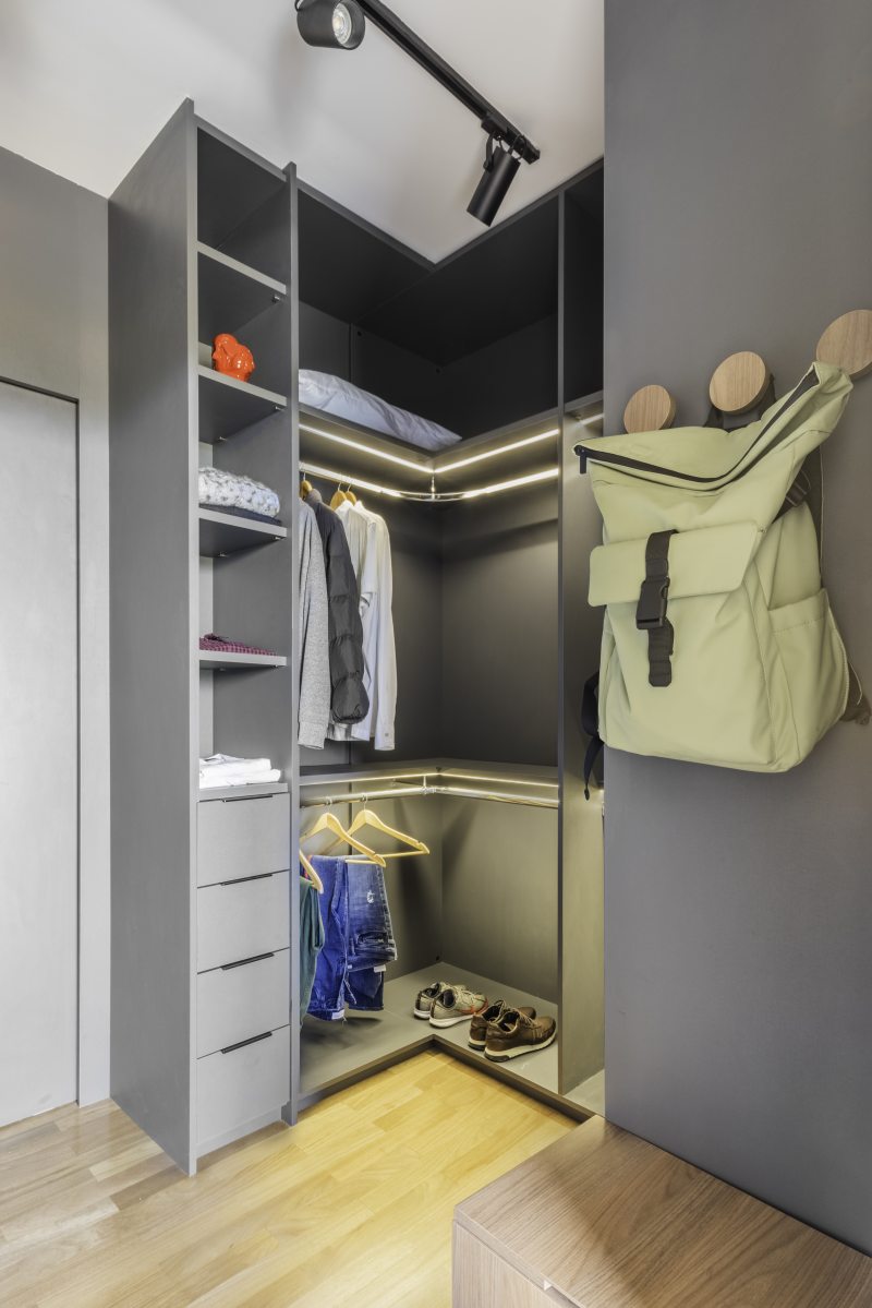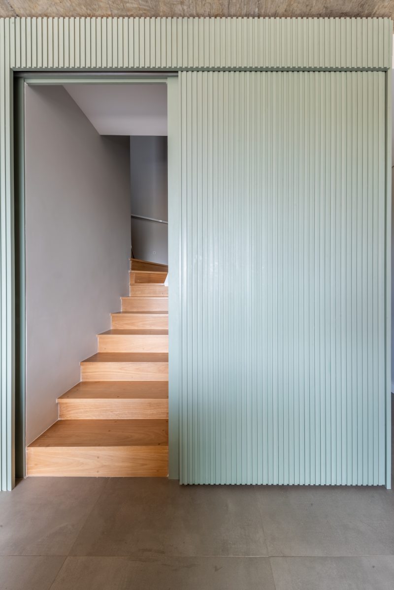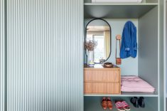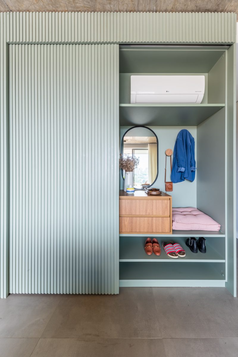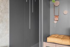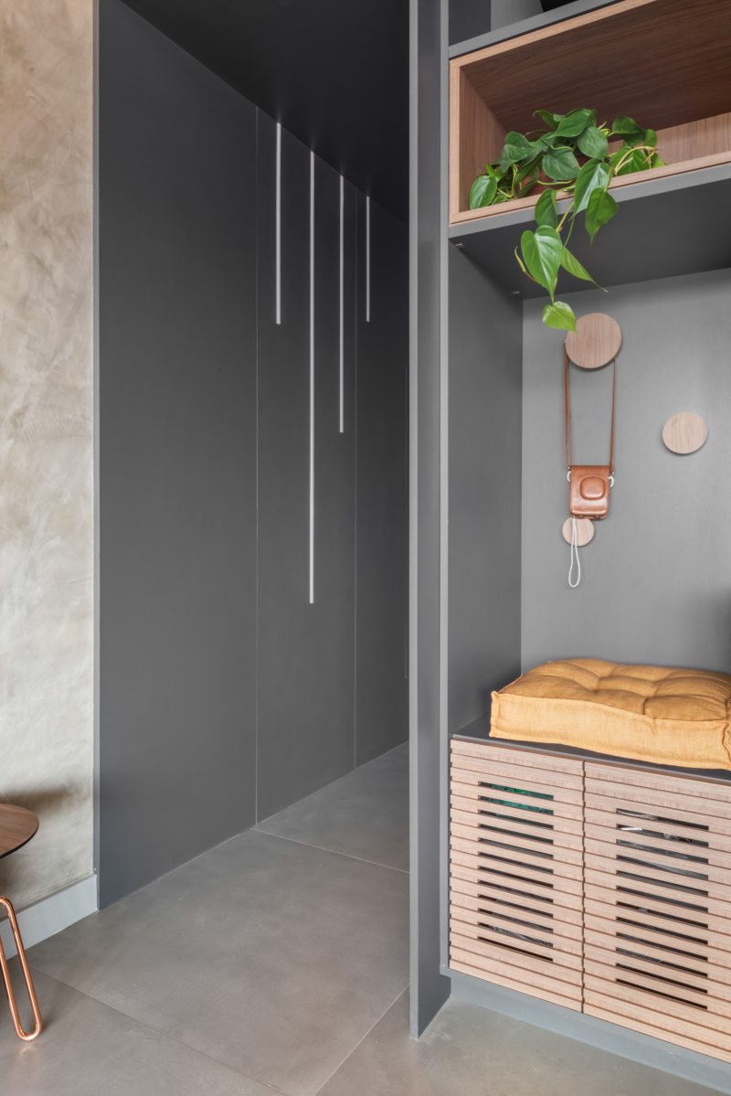 Pensar individualmente o décor dos dois duplexes com a mesma configuração foi um grande desafio para a equipe do BMA Studio. As diferenças, porém, ficam evidentes logo no hall de entrada dos dois imóveis: no dela, o hall de entrada inclui uma sapateira de marcenaria sob medida que atende à demanda feita pela moradora. Mimetizada no painel, quando a porta desliza para um lado abre-se o cantinho para os calçados e, quando levada para o outro, acontece o acesso à escada que leva para o andar superior.