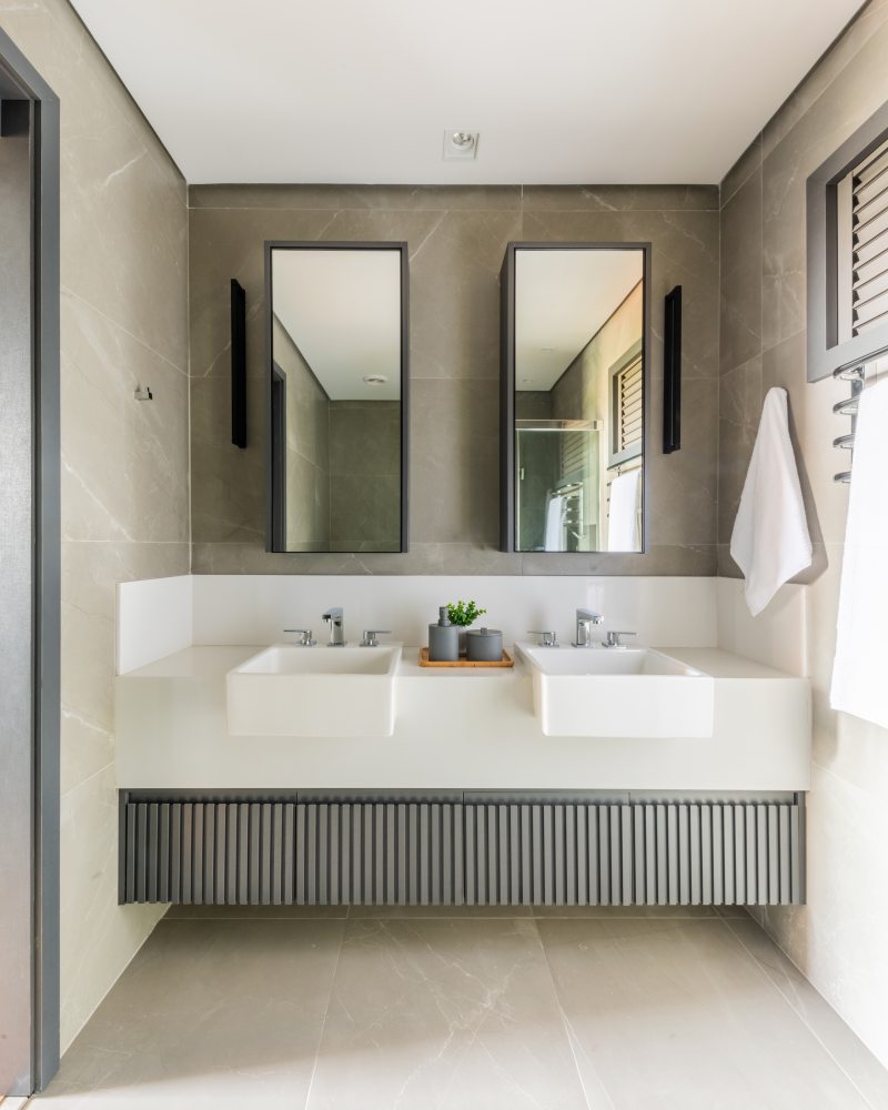 Uma das preocupações para os banheiros das suítes era não permitir pendurar as toalhas para secar por falta de ventilação. O toalheiro térmico resolveu esta questão. | Fotos: Guilherme Pucci