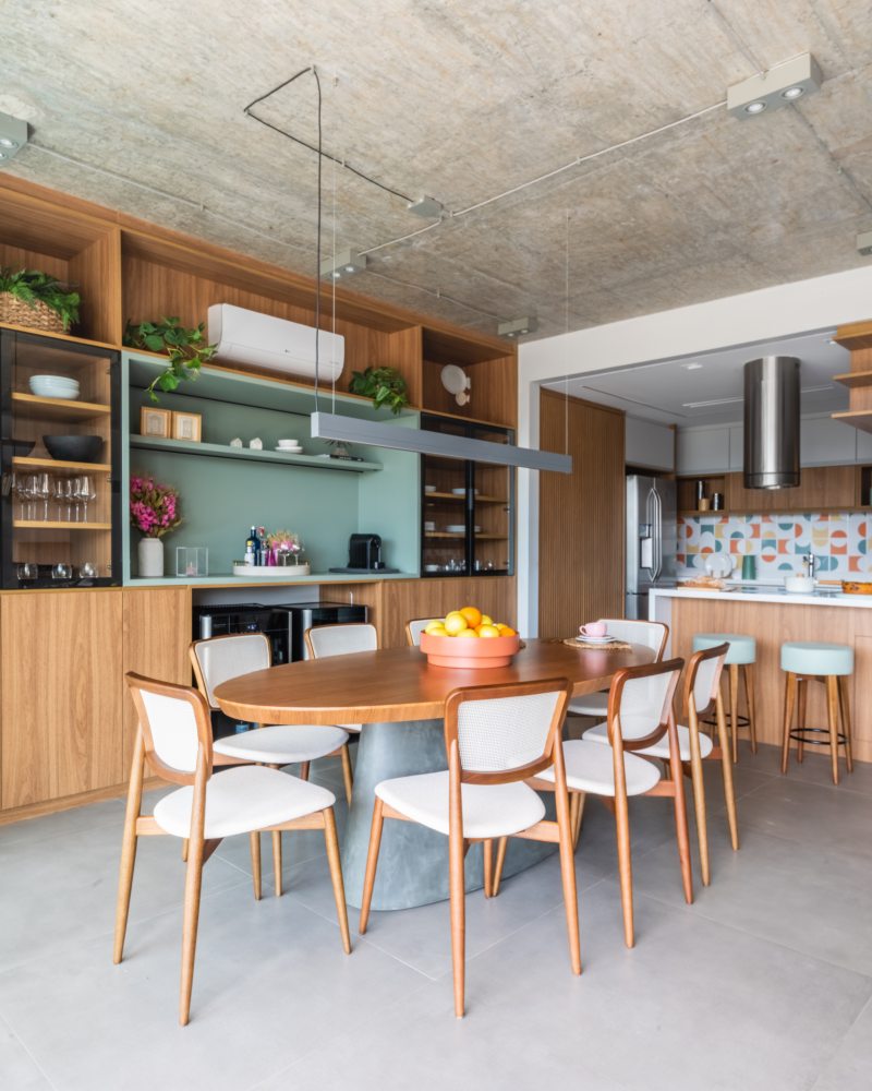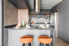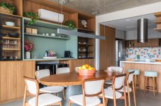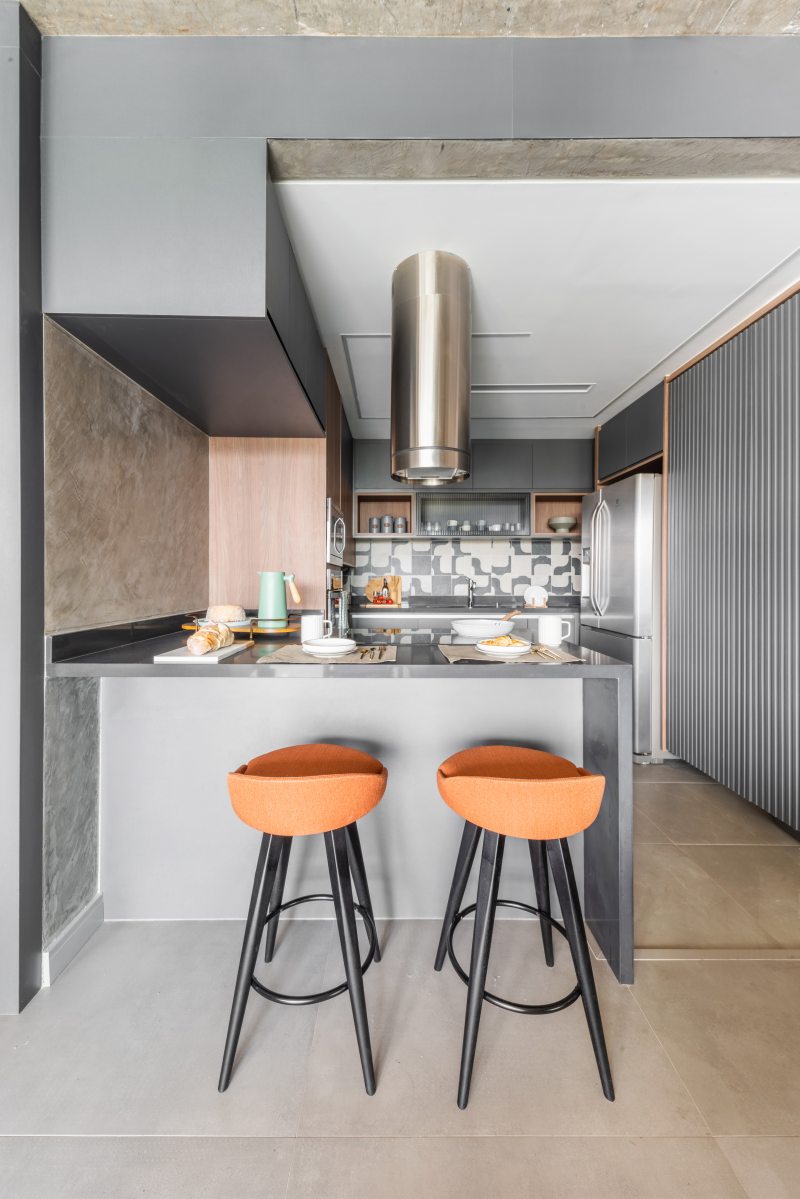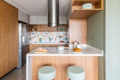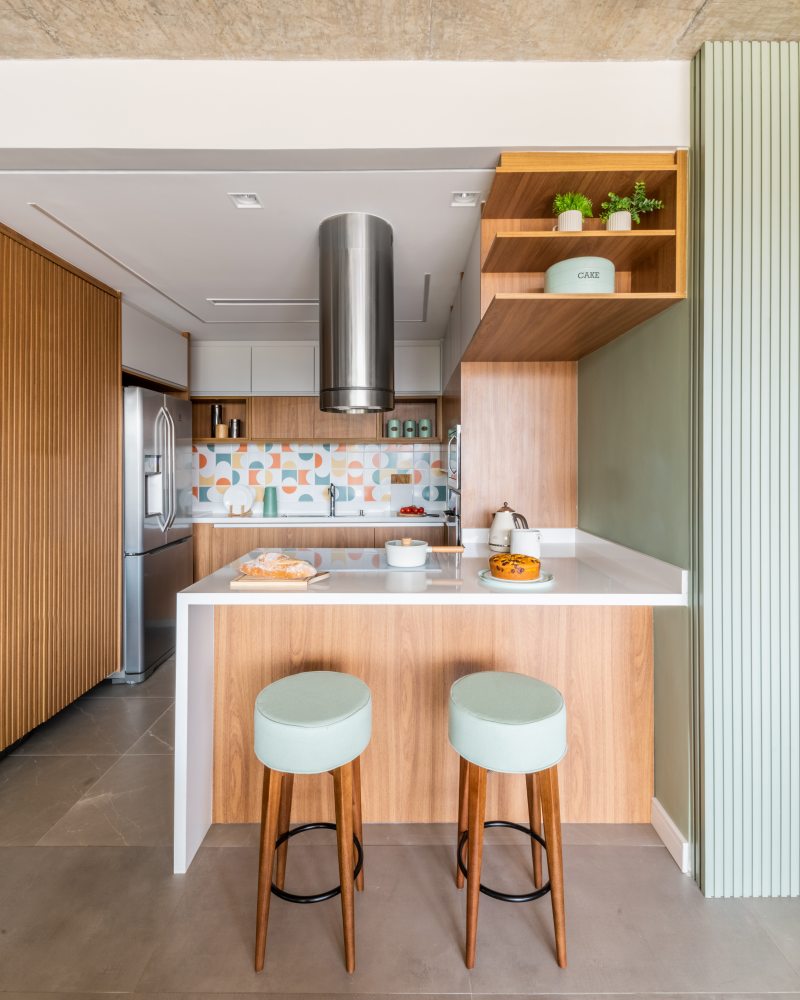 Nas cozinhas compactas, no estilo americano, os móveis sob medida e as banquetas oferecem espaço para refeições rápidas. O apartamento do irmão (acima) foi decorado com tons terrosos para reforçar as percepções de aquecimento e acolhimento, ao passo que o apartamento da irmã (abaixo), foi decorado com tons de verde para transmitir bem-estar e delicadeza. | Fotos: Guilherme Pucci