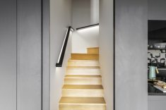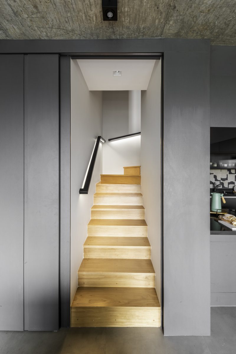 Para a irmã (direita), o arquiteto Bruno Moraes revestiu as pisadas e espelhos com madeira maciça. Para o irmão (esquerda), balizadores iluminam cada degrau | Fotos: Guilherme Pucci