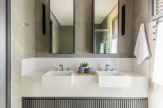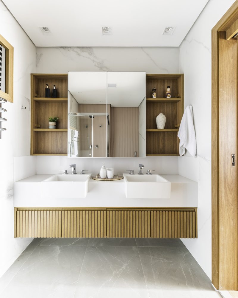 Com spots direcionáveis instalados no teto, o Rafael (à esquerda) e Renata (à direita) conseguem ter uma rotina prática dentro dos espaços com uma boa circulação e armários planejados pelo arquiteto. | Fotos: Guilherme Pucci