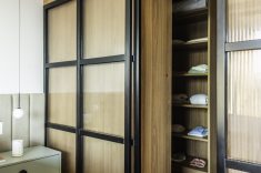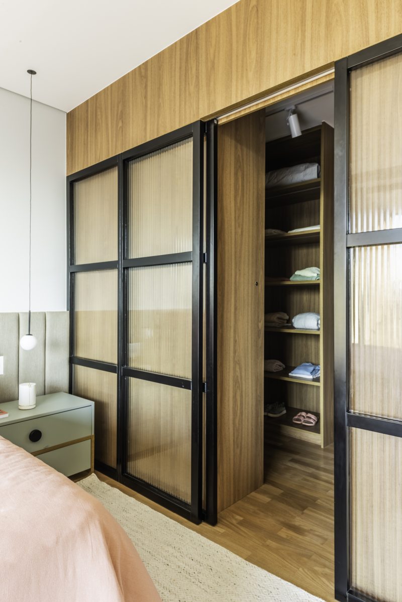 A praticidade de visualizar as vestimentas e ter fácil acesso a todos os itens armazenados são duas vantagens de um closet planejado. As portas de serralheria ganharam um destaque especial por trazerem ainda mais autenticidade para o ambiente.