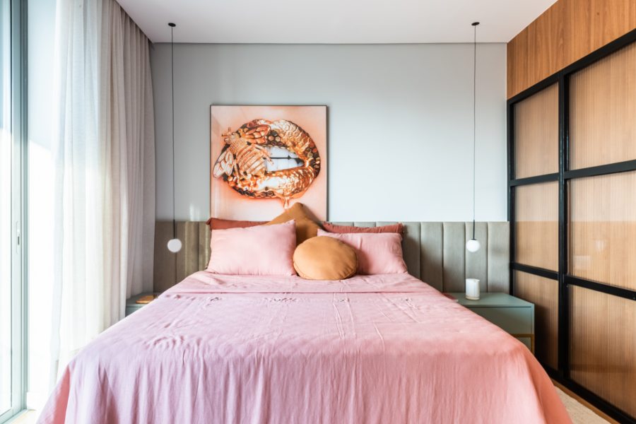 Na suíte masculina, acima, o arquiteto Bruno Moraes investiu em uma cortina de linho que trouxe leveza e sofisticação e, ao mesmo tempo, resolveu o quesito privacidade. No dormitório feminino, abaixo, o mood retrô é percebido pela mescla entre a madeira e serralheria que conversam com a estética atual de outros elementos | Fotos: Guilherme Pucci