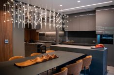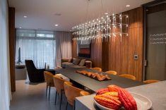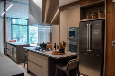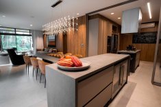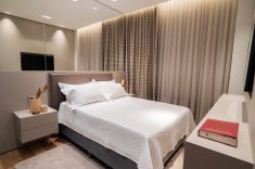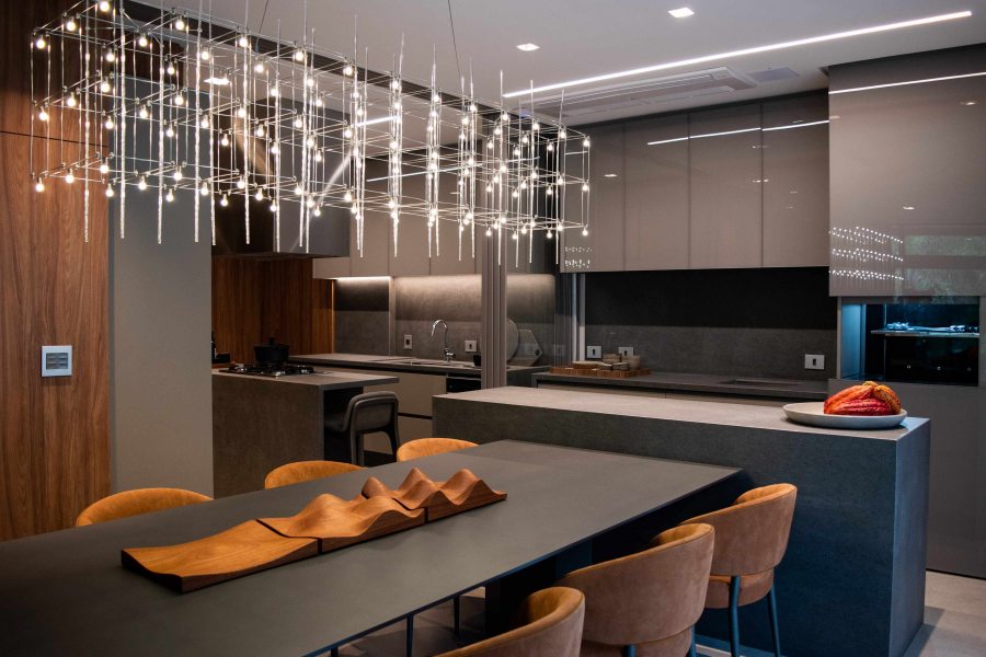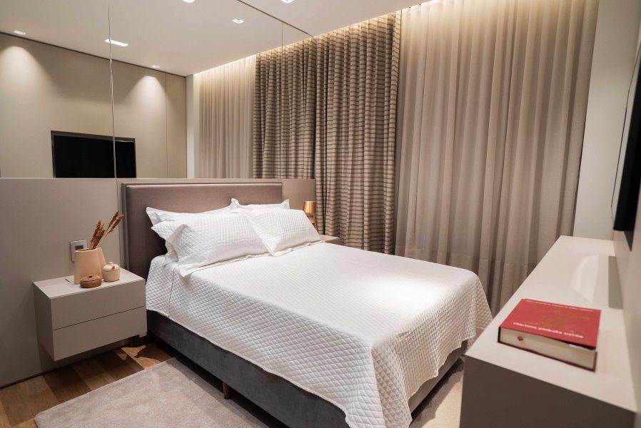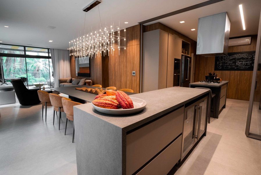 De acordo com o profissional, o maior destaque é para a cozinha com fogão em ilha integrada com a bancada gourmet. “O lavabo espaçoso e o closet com a medida perfeita com capacidade para tudo também ganham bastante evidência”, comenta Glei Tomazi. Na área intima, as suítes têm tecidos com texturas marcantes, bancadas generosas para estudo e iluminação indireta no painel de cabeceira.