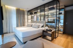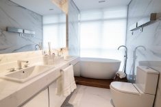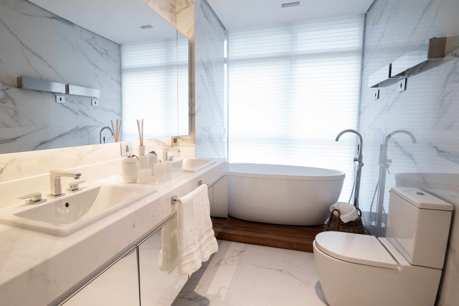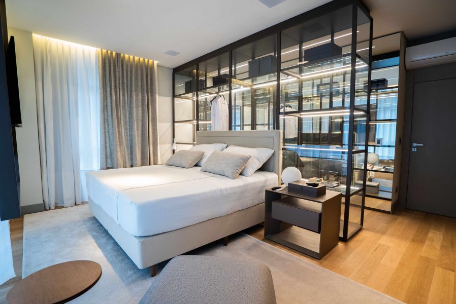 Para a suíte máster, os arquitetos projetaram um maravilhoso closet com transparência através de portas em vidro, que valorizaram o espaço e ampliaram ainda mais o quarto. O mobiliário foi escolhido para atender ao espaço oferecendo conforto de forma condizente com o conceito contemporâneo do apartamento. Ganham destaque na decoração o sofá Platô da Dieedro e a mesinha lateral Toy, peças icônicas de design que são, inclusive, assinaturas do escritório Jayme Bernardo. “E o banheiro é todo claro e demonstra a possibilidade de receber uma sofisticada banheira de imersão”.