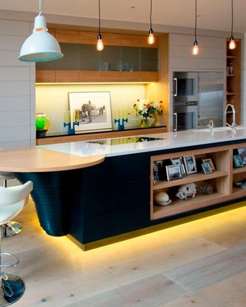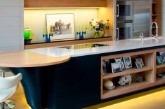Iluminação: Trazendo aconchego e tranquilidade, a iluminação indireta com fitas de LED ou luminárias deixam o ambiente mais elegante. Além disso, contrastam muito bem com as cores fortes, como Honey, e ajudam na hora de preparar as refeições. Gostou das ideias? Confira as imagens em nossa galeria.
