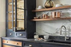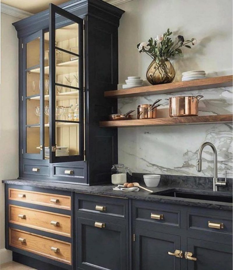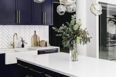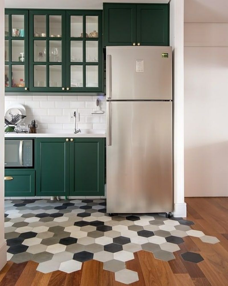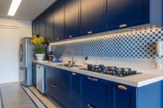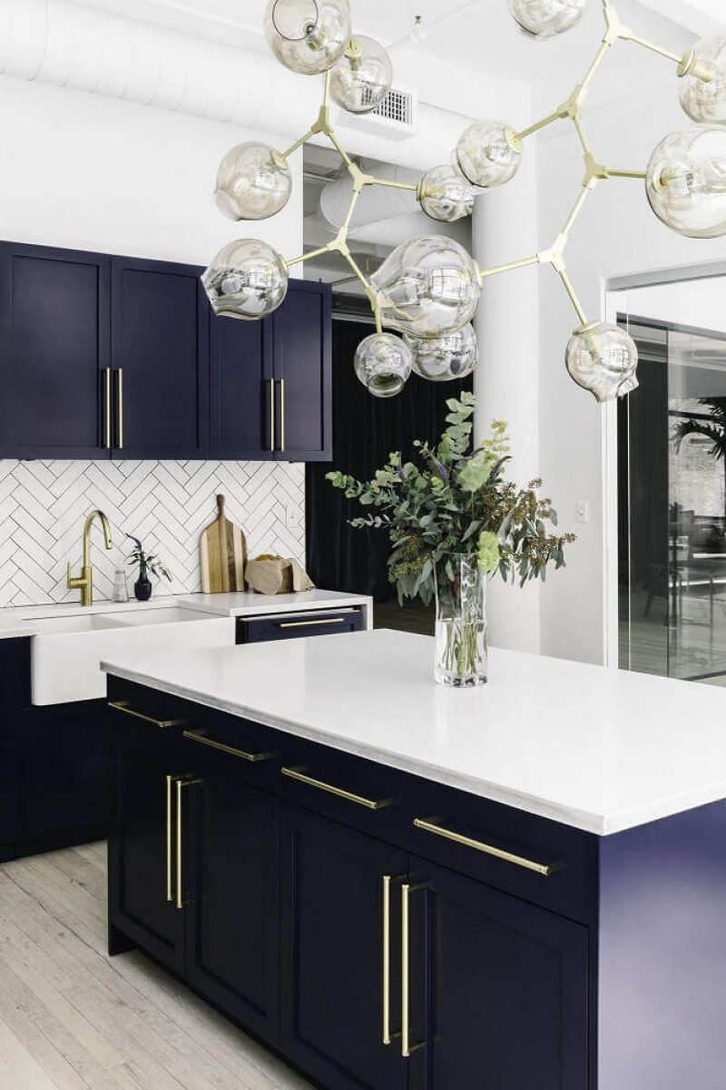 A possibilidade de fazer uma decoração em dois tons, contrastando um mármore escuro com armários brancos, é uma tendência que traz luxo e sofisticação para a cozinha. O verde e o azul escuro na cozinha são dois dos tons mais em alta de 2021, mantendo-se como uma das mais fortes escolhas para armários de cozinha. Combina muito bem com toques claros e detalhes em dourado para um design clássico. Para obter um bom contraste, vale a pena investir em armários e revestimentos dessa cor e bancadas de tons mais claros. O verde também fica incrível em contraste com itens dourados e pisos claros.