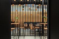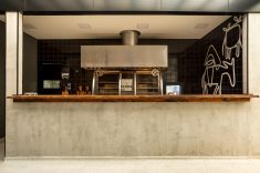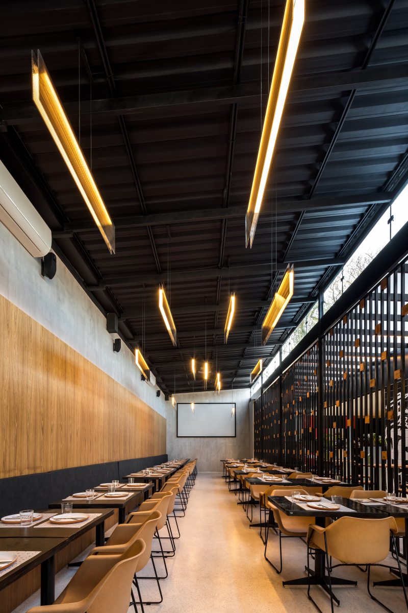 No bloco direito ficam a sala de jantar e o bar de bebidas, ambos com proposta moderna e minimalista. O concreto aparente da estrutura e os elementos em aço preto ganham a sensação de acolhimento graças a painéis e balcões de madeira louro-freijó (que remetem à madeira das fogueiras). A proposta intimista é assegurada também pelo luminotécnico apurado, que tira partido da iluminação indireta sem prejudicar a claridade necessária à área do restaurante. Luminárias de design local, produzidas pela Dsgn Selo, remetem sutilmente ao “calor das fogueiras” (especialmente as luminárias “favo de mel” do salão principal, projetadas com exclusividade para o espaço), completando a atmosfera ideal para saborear os cortes especiais servidos pela casa.