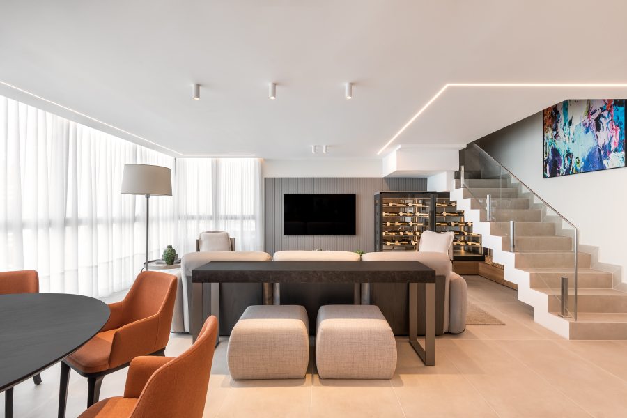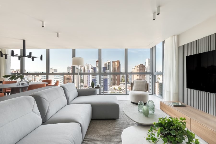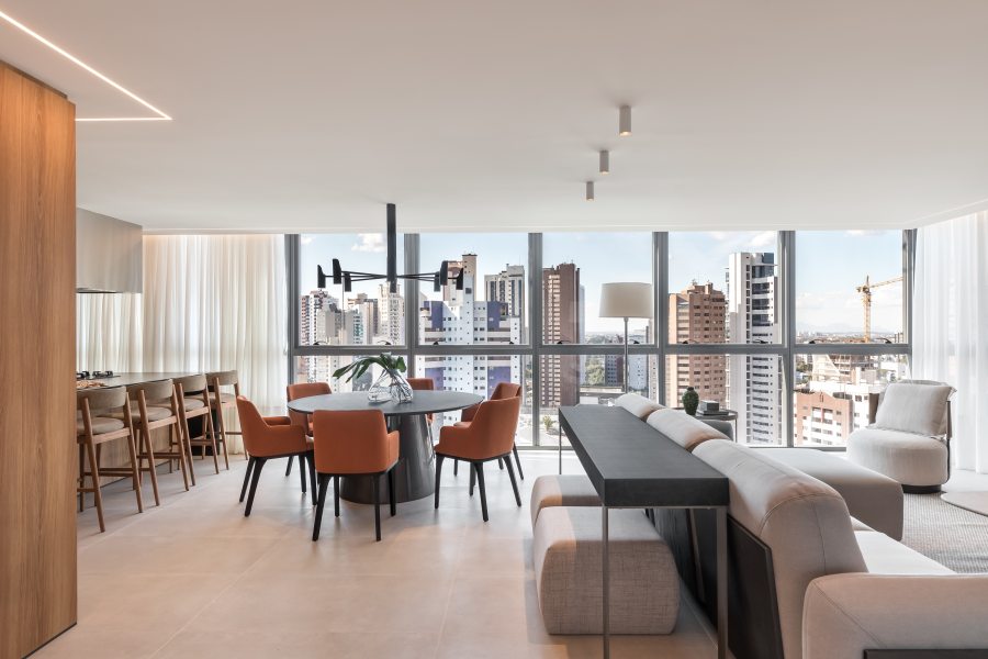 Com projeto arquitetônico do escritório Realiza Arquitetura e design de interiores de Jayme Bernardo Arquitetura, o imóvel traz o espírito da casa da montanha para residências panorâmicas com vista privilegiada para a paisagem curitibana.