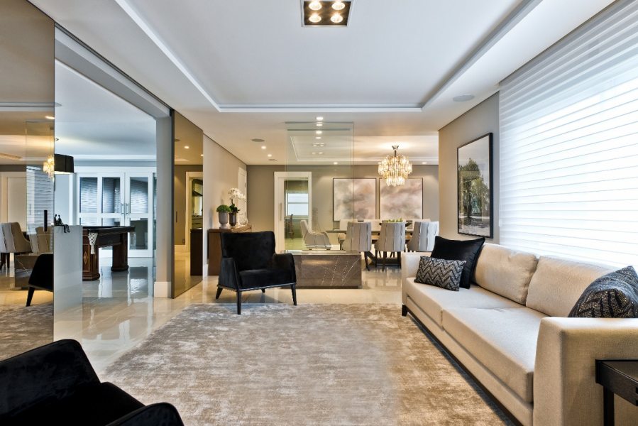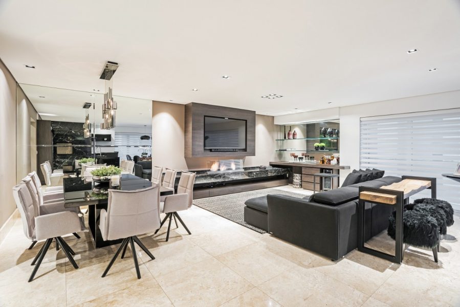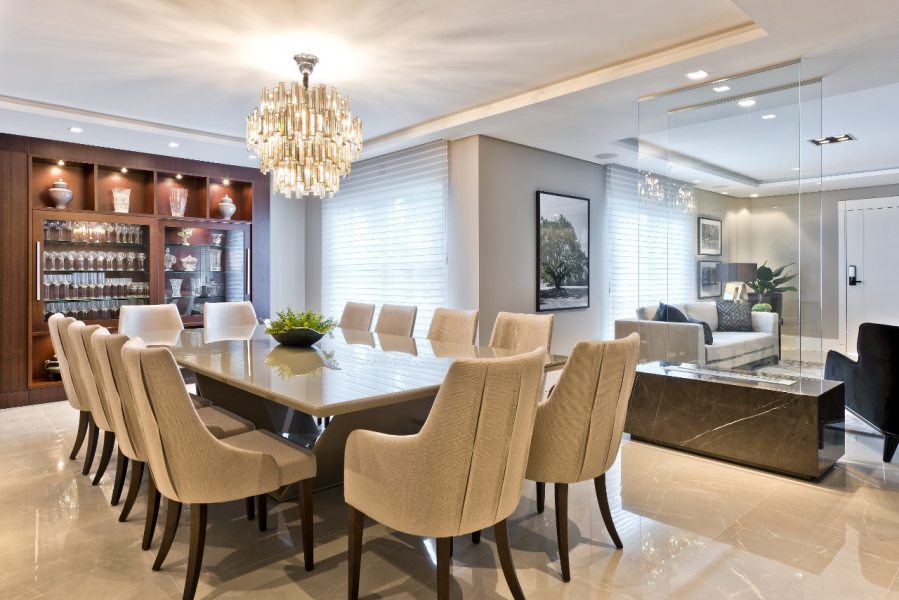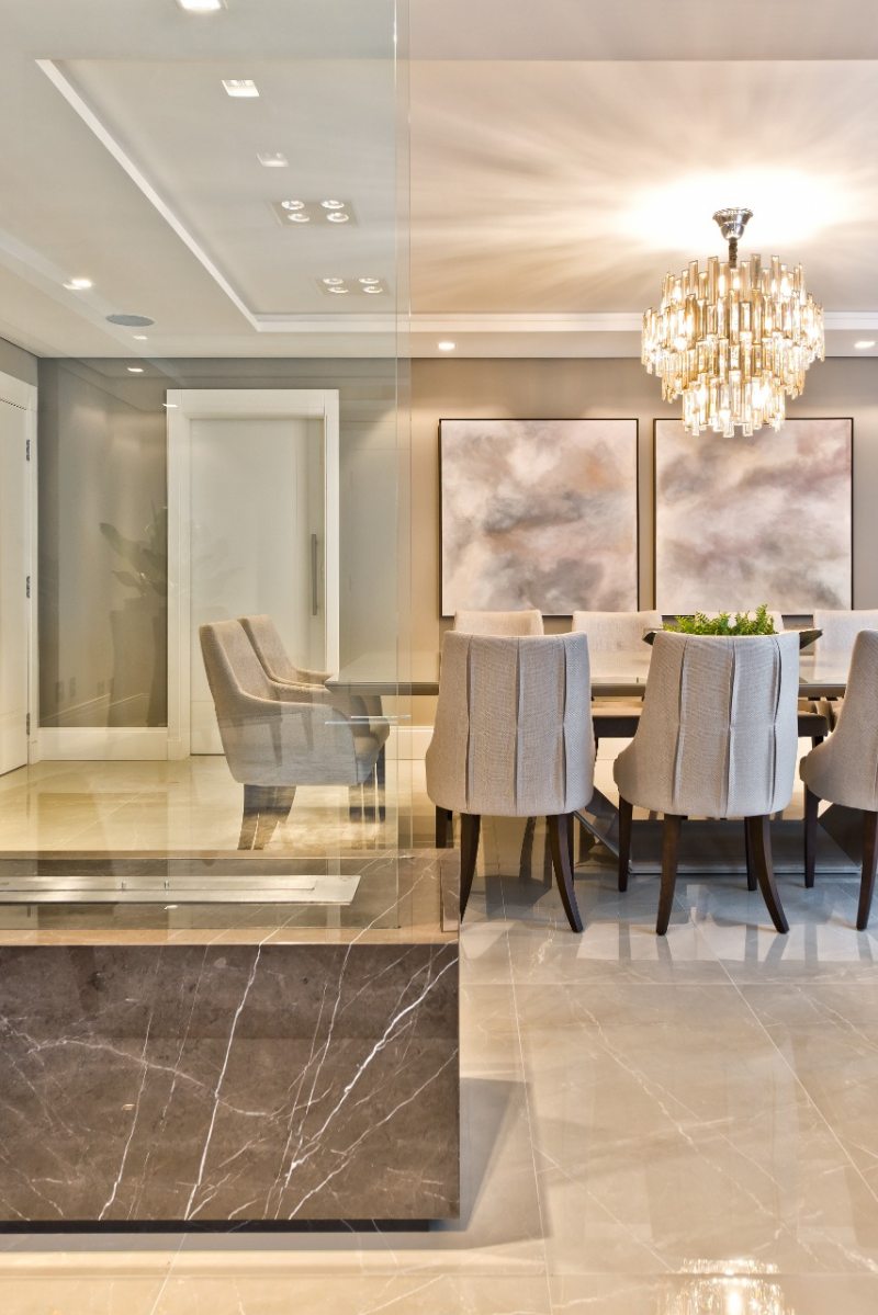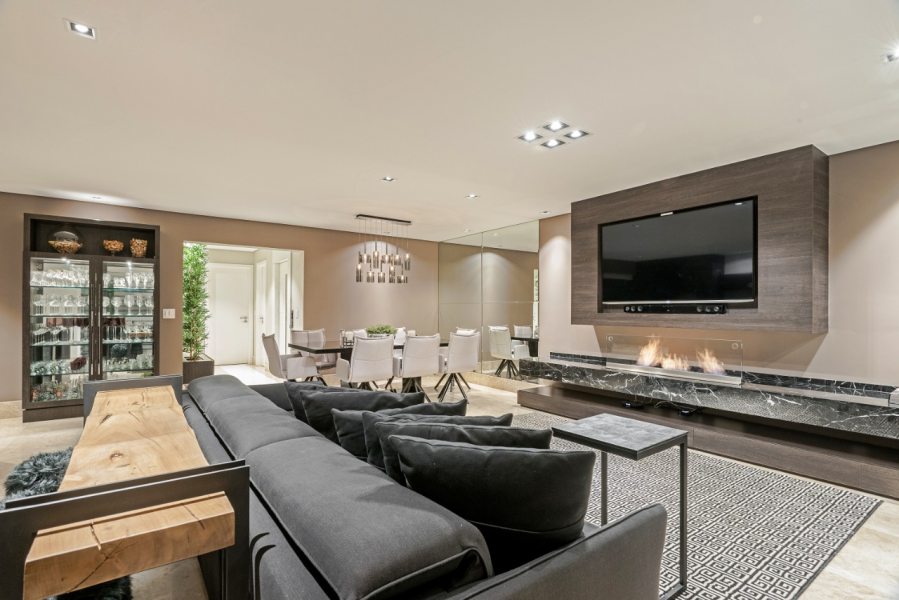 A praticidade e facilidade de se intalar um kit a álcool torna a opção excelente para espaços menores ou com limitações a reformas. Além de ecológica e prática, a lareira a álcool se adapta ao ambiente sem precisar de duto de ventilação externa e pode ser facilmente integrada no mobiliário do ambiente. Na opção abaixo as folhas de vidro temperado delimitam o espaço da lareira e também funcionam como divisória para separar os ambientes da sala de estar e sala de jantar.