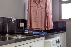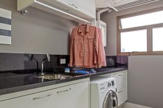 Além dos armários, uma bancada de serviço também é imprescindível. É nesta área de apoio que o morador ou a funcionária do lar podem deixar as roupas limpas após tirá-las da máquina ou para passá-las. "Na sequência do tanque, podemos estender para conceber uma área plana ou até mesmo apostar em soluções de tampas retas que criam uma bancada móvel, escondendo a saída de água", indica a arquiteta.