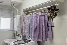 Quem aqui não fica desanimado com a etapa de passar a roupa? Além do trabalho, muitas vezes fica faltando o local para pendurar, por exemplo, os cabides com as peças passadas. "Com o volume que costumamos acumular, não dá para sair toda hora da área de serviço e levar cabide por cabide para o armário", avalia Cristiane Schiavoni com a sua experiência profissional que coloca a mão na massa em casa. Por isso, nada melhor do que estender as roupas passadas. "Com esse recurso, a atividade torna-se mais prática e rápida", compartilha.