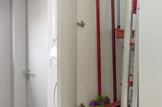 Com a marcenaria planejada, o projeto de Cristiane Schiavoni dedicou uma abertura específica para receber vassouras, rodos, pá de lixo e escada. Na parte inferior, o aspirador de pó | Foto: Carlos Piratininga