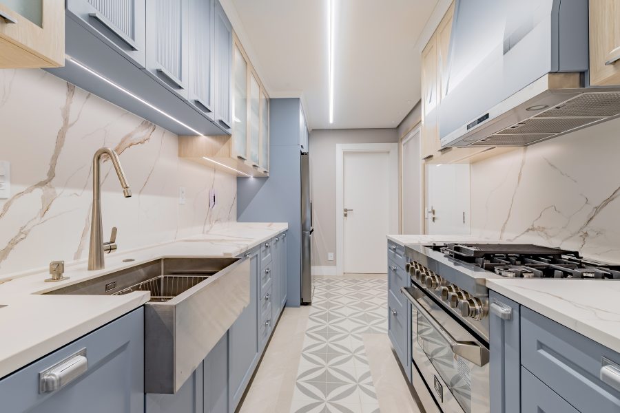 A cozinha, em estilo americano, combina laca azul com referências ao estilo clássico. O ambiente reúne eletrodomésticos de última geração, incluindo um fogão de piso com visual profissional. O piso mescla dois porcelanatos, um com padrão marcante e outro neutro.