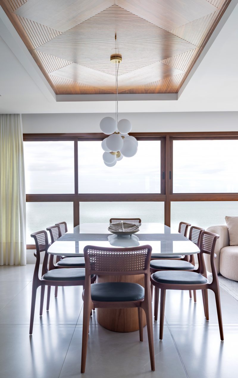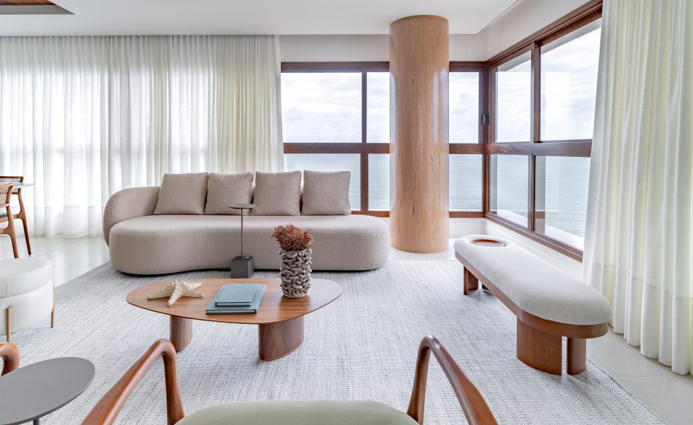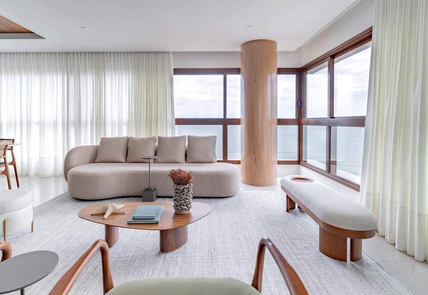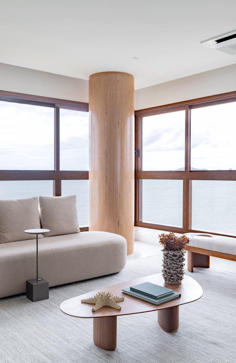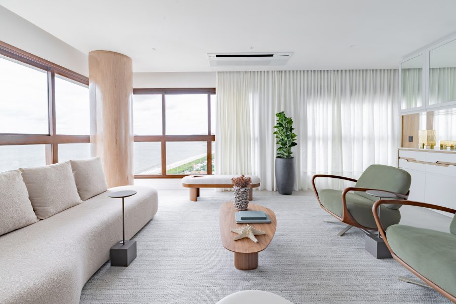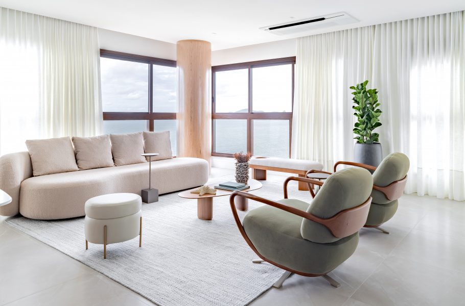 Adquirido ainda na planta por um casal de empresários em busca de um refúgio à beira-mar, o apartamento passou por um acompanhamento fase a fase durante projeto e obra. Esse processo permitiu ajustes estratégicos em pontos elétricos, hidráulicos, climatização, gás e forro, além de viabilizar uma mudança importante na planta original: das quatro suítes previstas, permaneceram duas, enquanto as demais deram lugar a um home office, ampliando a área social e favorecendo a integração dos ambientes.