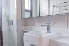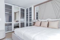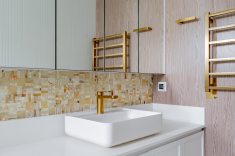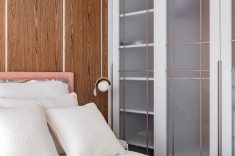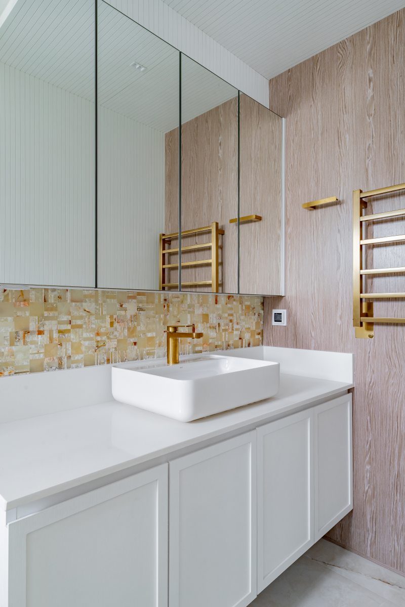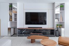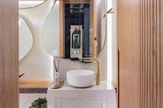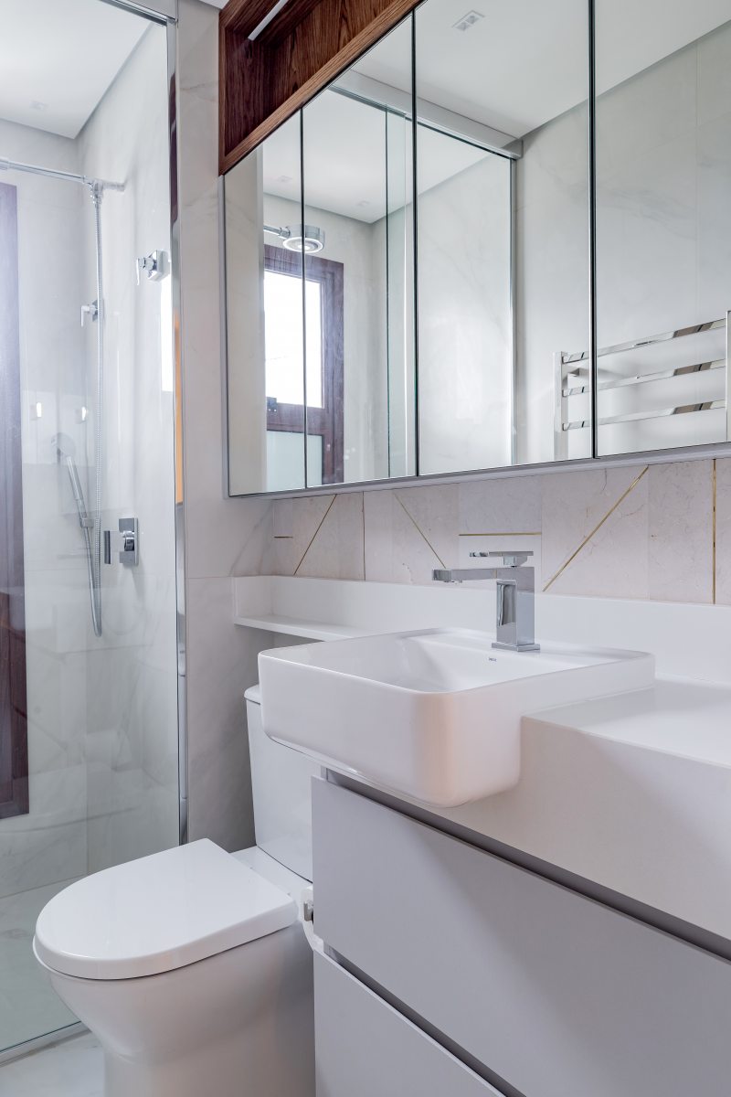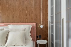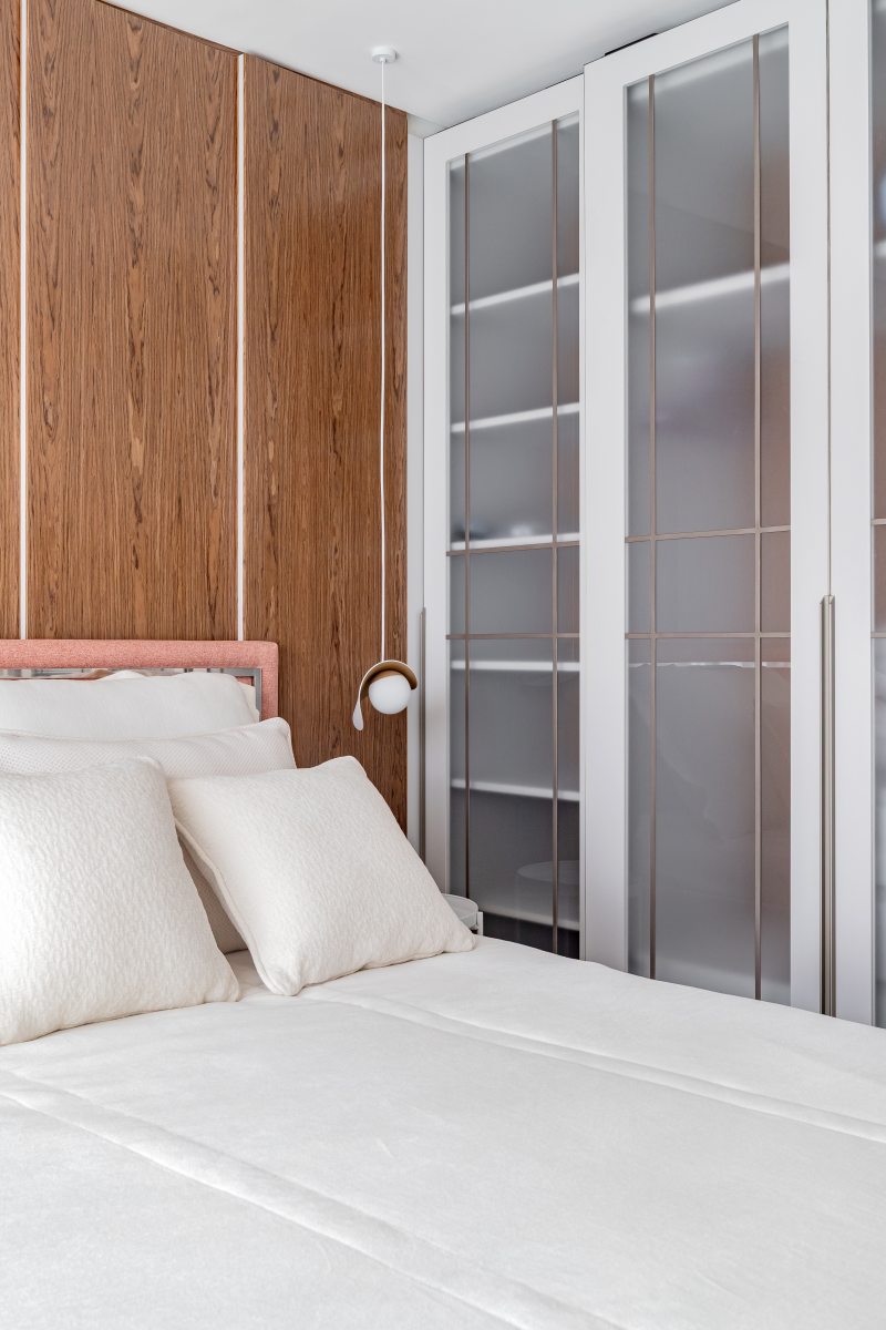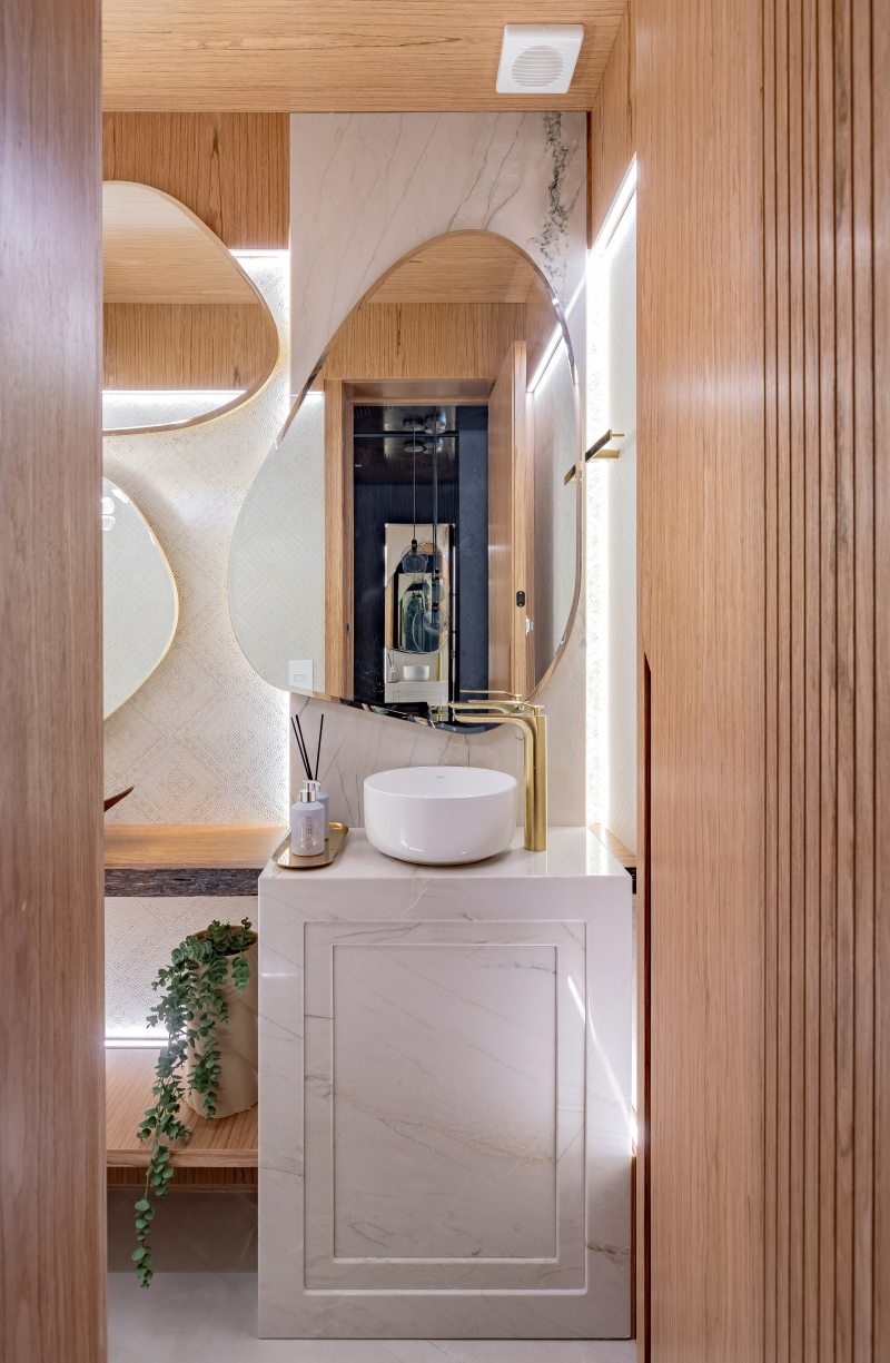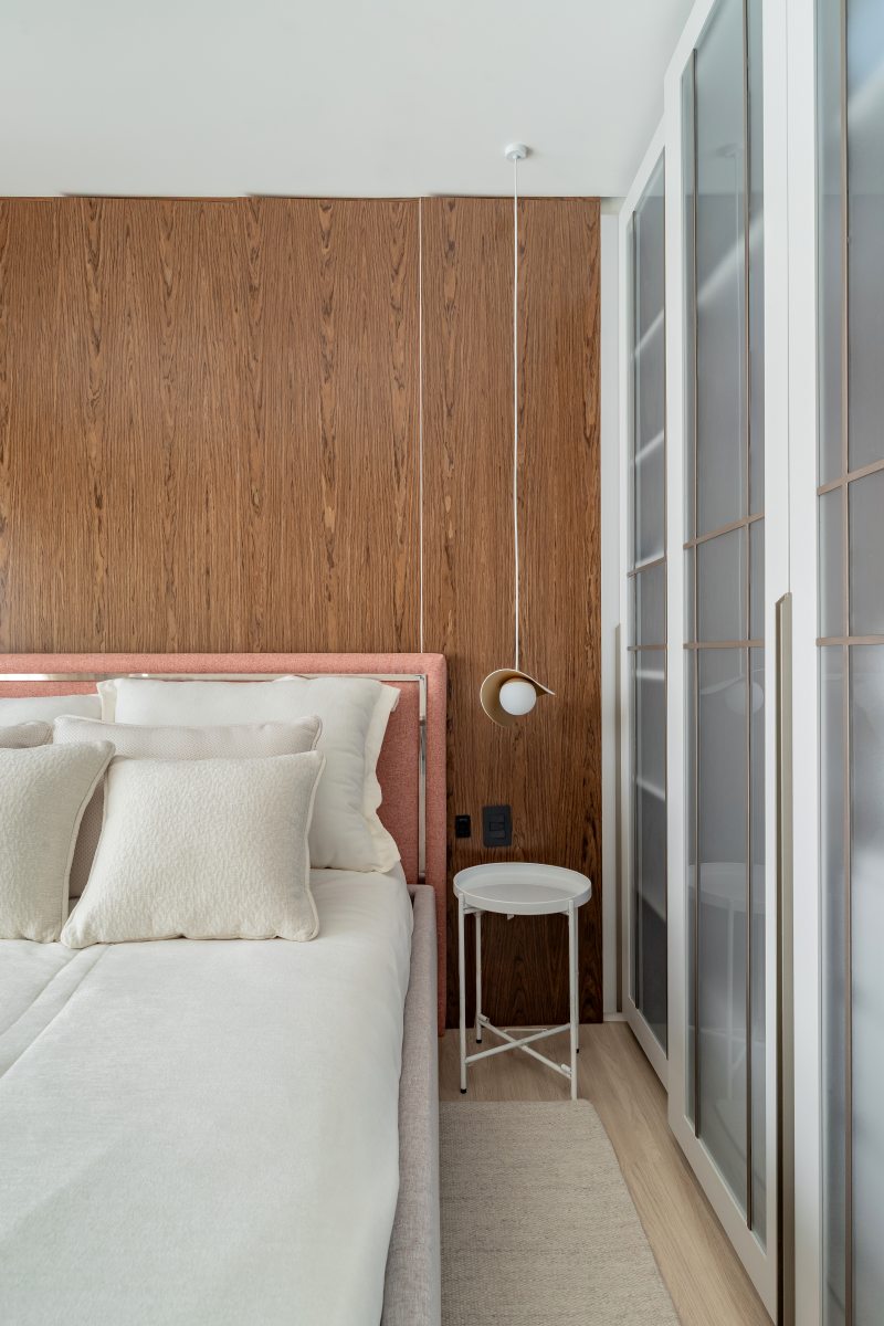 Na área da churrasqueira, o mármore Paraná reveste a estrutura, enquanto a bancada alta em Nero Marquina cria contraste. Na área íntima, o piso em madeira atende ao pedido de conforto térmico. A suíte master adota paleta neutra e cabeceira estofada desenhada pelo escritório. O banheiro conta com aquecimento de piso e metais dourados. A segunda suíte também possui marcenaria em lâmina natural com iluminação em LED embutida e banheiro com aquecimento de piso.