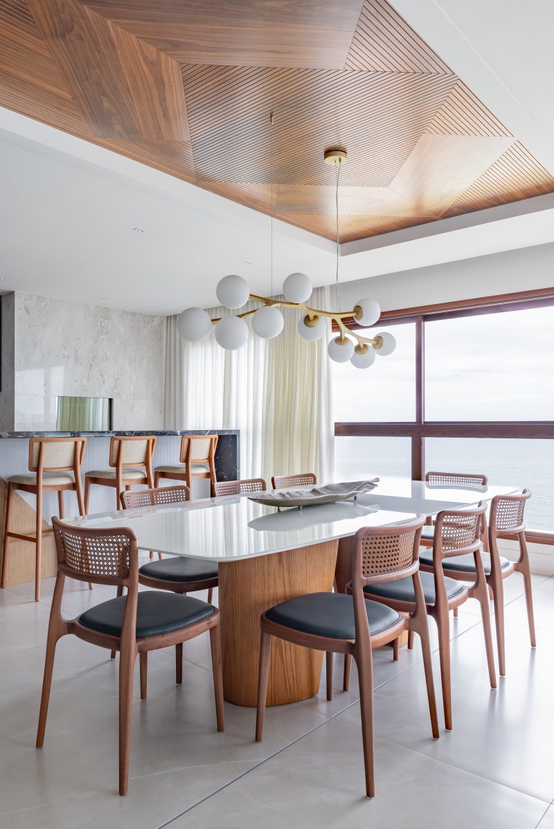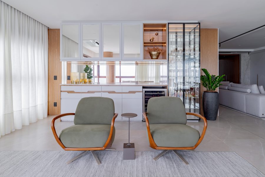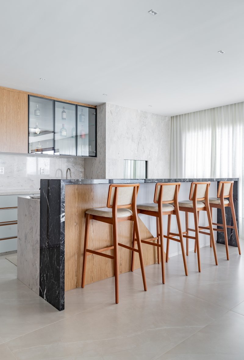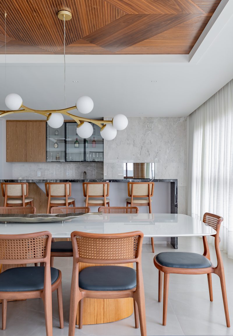 A área social orienta a proposta. O layout privilegia espaços conectados para convivência. Painéis em marmoraria revestem paredes, e o piso em porcelanato 80 × 160 contribui para a leitura contínua dos ambientes. O mobiliário inclui peças assinadas por designers brasileiros, como a Poltrona Eixo, de Rejane Carvalho Leite, as cadeiras BEC, de Luan Dal Sálvio, e poltronas giratórias de Pepe Lima.