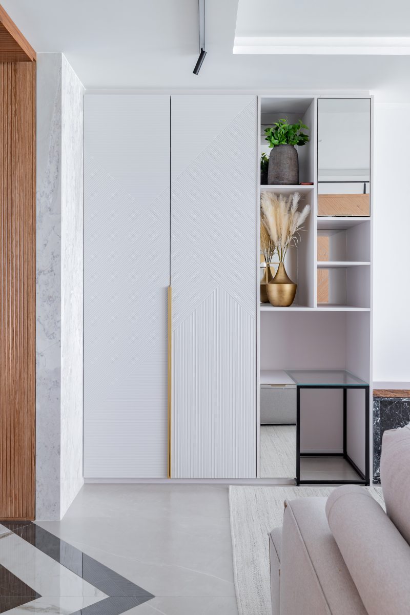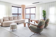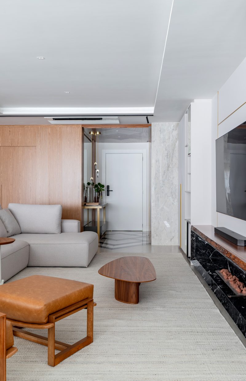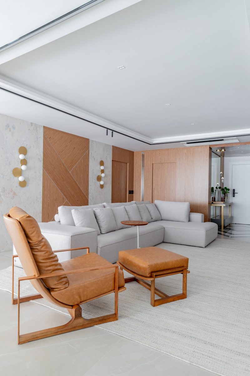 A área social orienta a proposta. O layout privilegia espaços conectados para convivência. Painéis em marmoraria revestem paredes, e o piso em porcelanato 80 × 160 contribui para a leitura contínua dos ambientes. O mobiliário inclui peças assinadas por designers brasileiros, como a Poltrona Eixo, de Rejane Carvalho Leite, as cadeiras BEC, de Luan Dal Sálvio, e poltronas giratórias de Pepe Lima.