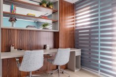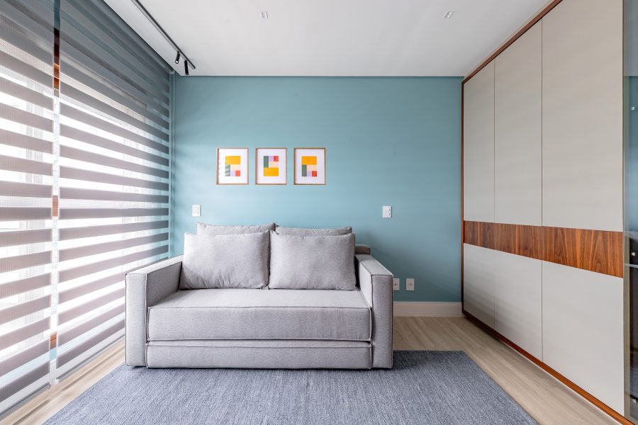 O home office foi concebido como espaço multifuncional, reunindo estante, armários planejados e sofá-cama, podendo acomodar hóspedes quando necessário.