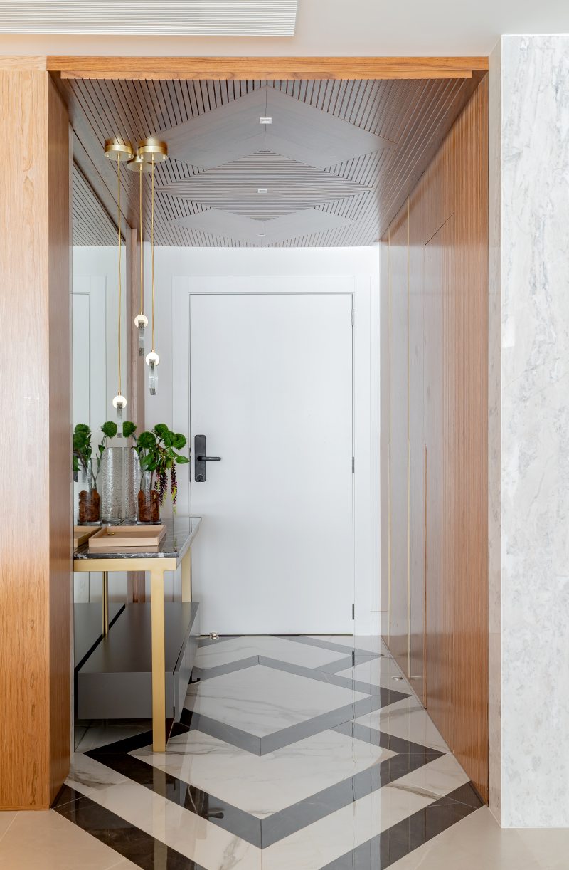 O hall de entrada recebeu paginação geométrica em porcelanato preto e branco. As paredes foram revestidas com lâmina natural de madeira e o forro, também em madeira, foi desenhado sob medida.