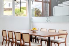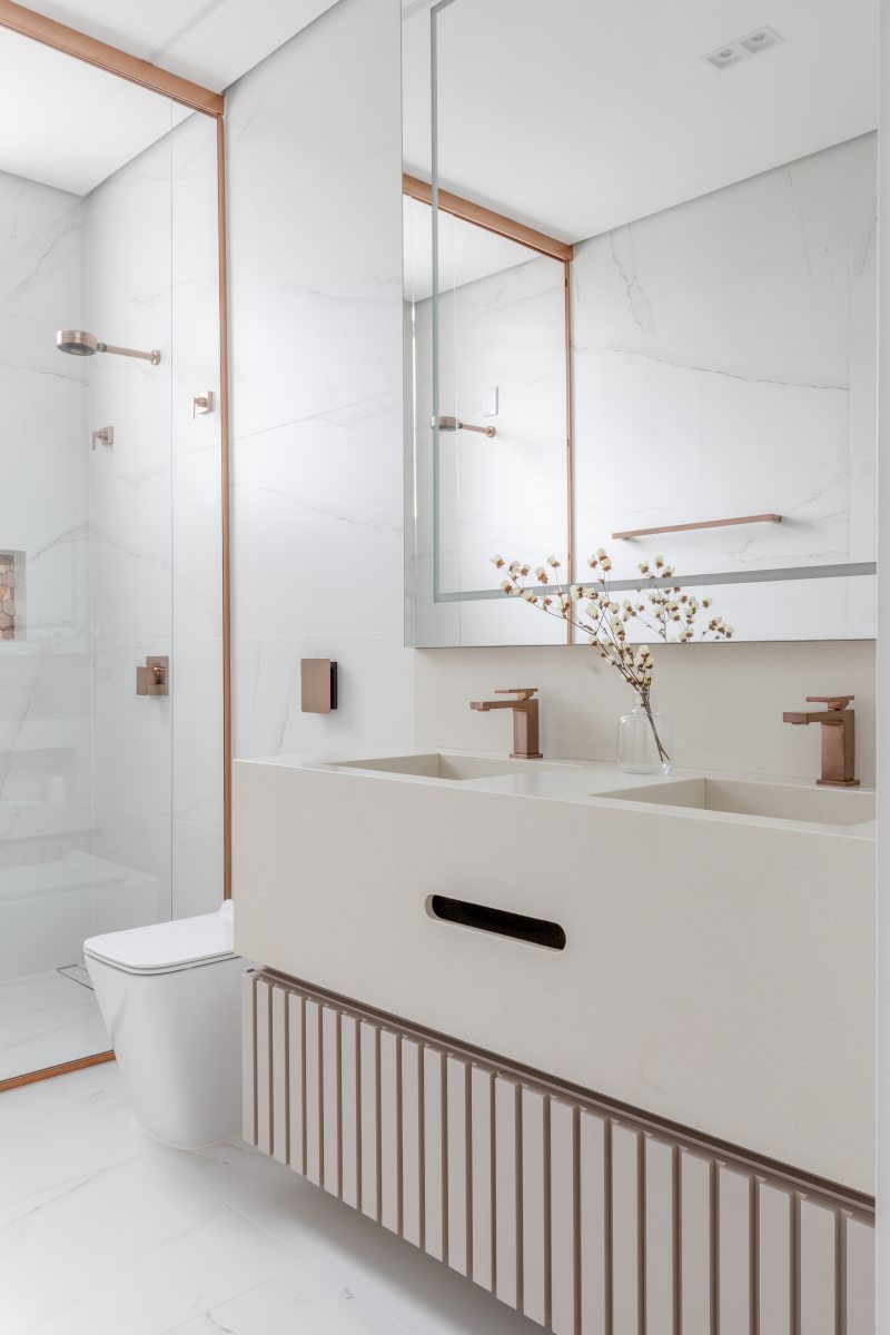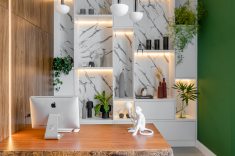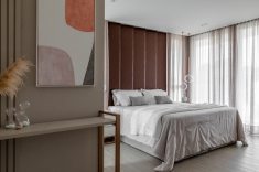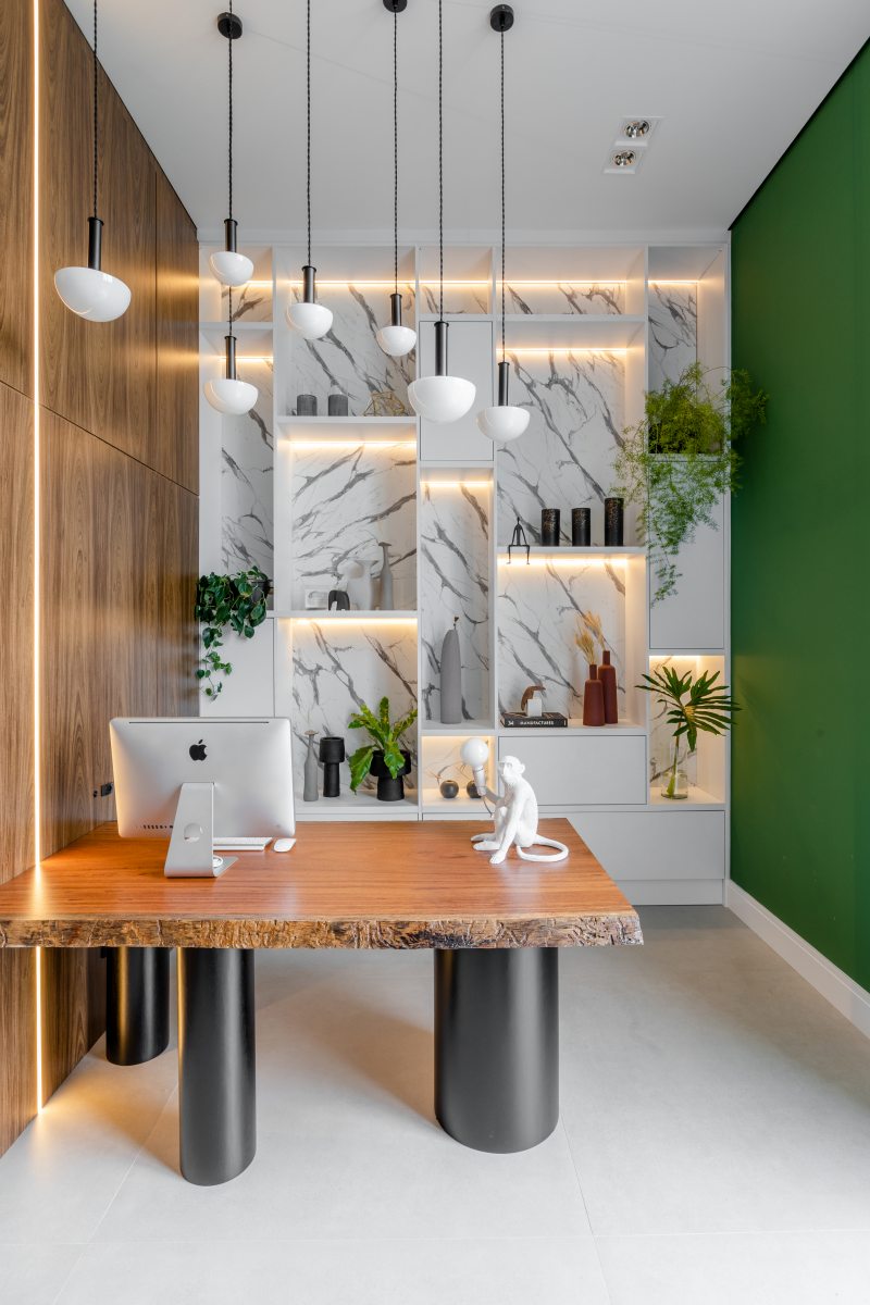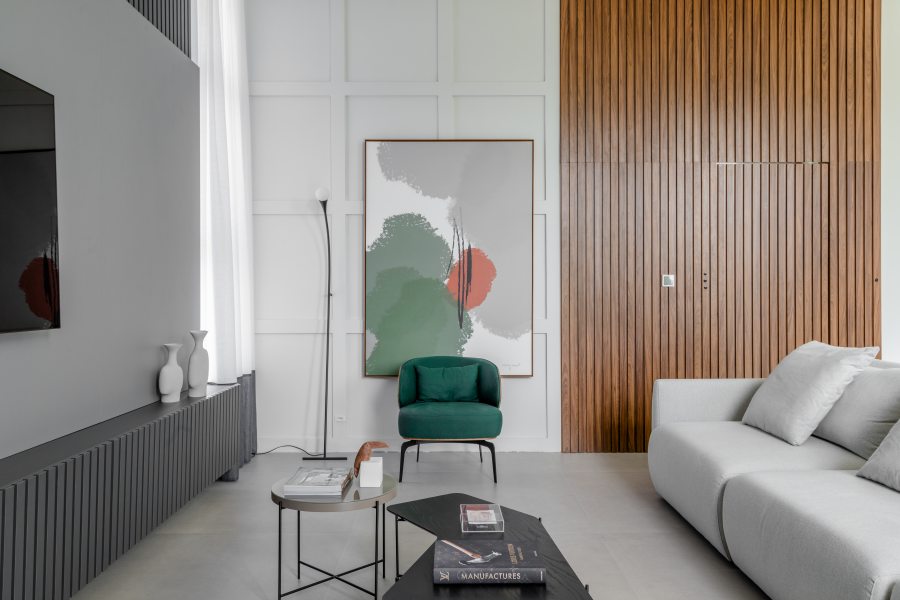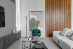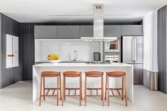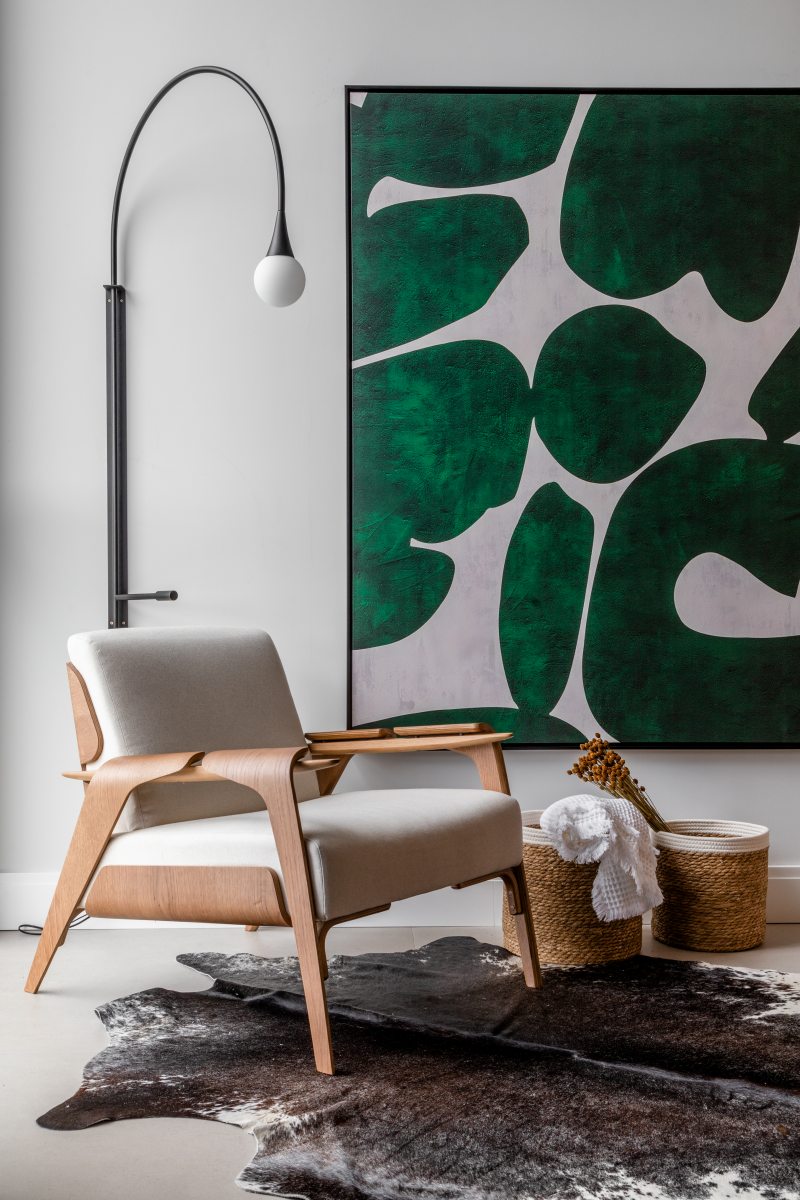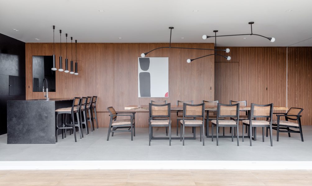 Outra aposta do projeto são os painéis ripados que camuflam sutilmente a porta de acesso principal e os acessos para o escritório e área íntima. Uma obra de arte perfeitamente lapidada, pronta para ser vivida.
