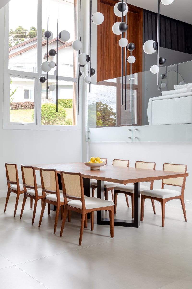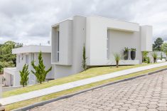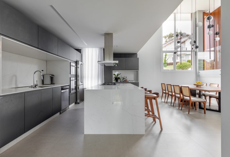 “Os clientes solicitaram uma casa ampla, onde o social e a área íntima ficassem no mesmo pavimento. Para executar essa ideia sem precisar fazer vários pavimentos na casa, aproveitamos o desnível do terreno para posicionar a garagem e área de festas no nível mais baixo, enquanto a casa se estabelece em cota superior e em um único pavimento, separados por um leve desnível na sala de estar”, relembra Jackson.