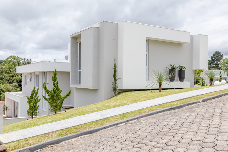 No projeto desta casa de 400 m² desenhada pelo escritório Studio Kaza, dos arquitetos Jackson Zacharias e Evelyn Gruber, o material bruto se apresentava desafiador: um terreno de esquina com desnível de cinco metros, situado na entrada de um condomínio fechado em São Bento do Sul, Santa Catarina.