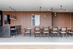 Entre execução e entrega final, adiada por conta da falta de materiais gerada pela pandemia, a casa levou dois anos para ser concluída. Os tons do concreto e da madeira inspiraram a arquitetura externa e de interiores: “Nosso escritório ama trabalhar com revestimentos naturais e aqui não poderia ficar de fora a madeira natural de cumaru e as pedras de ardósia, elementos que remetem à natureza”, explica o arquiteto.