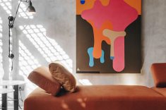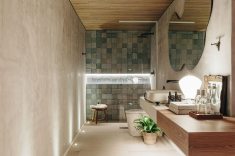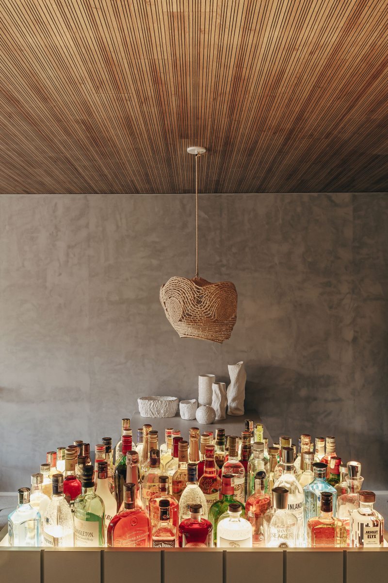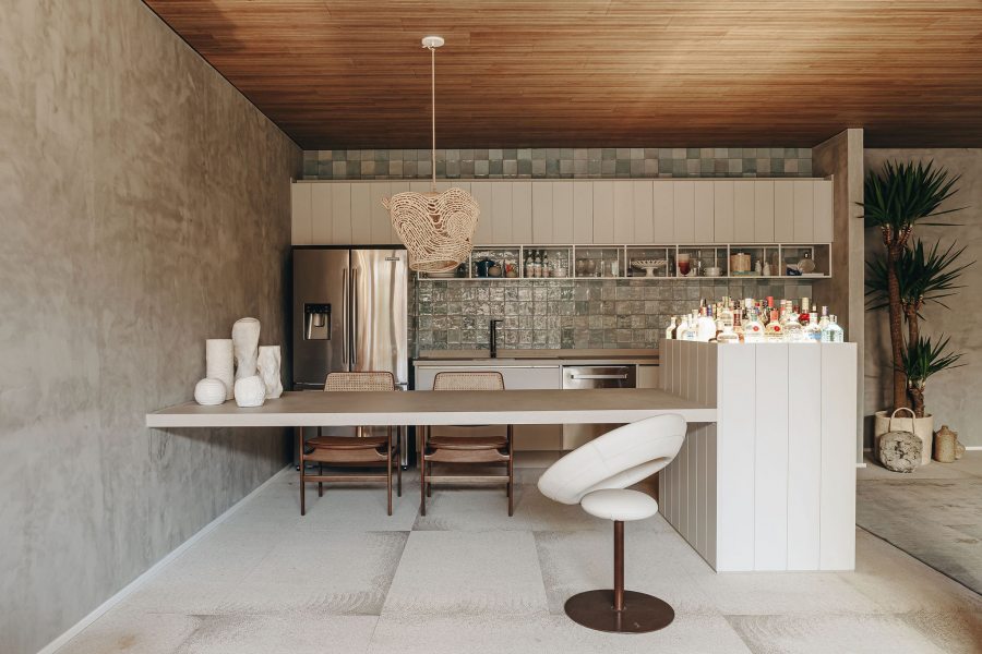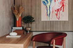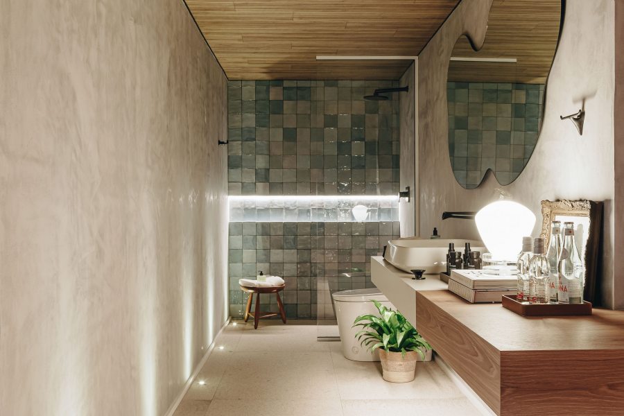 No forro, o revestimento acústico Swissclic, da Divisystem, traz ainda mais textura ao interior e condiz com o mobiliário planejado da cozinha Bontempo, que recebeu bancadas da linha Lastras da Porcelanateria, da Portobello. O ambiente também recebe revestimento de azulejos irregulares, da linha Casablanca Riviera, com uma paleta de cores aquarelada e aspecto sofisticado – material que se repete no banheiro e dá tom à linguagem visual do loft. O toque final fica por conta da adega oculta sob um generoso bar iluminado, disposto ao lado da mesa de jantar de modo que os drinques possam sempre se tornar ótimos acompanhamentos.