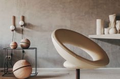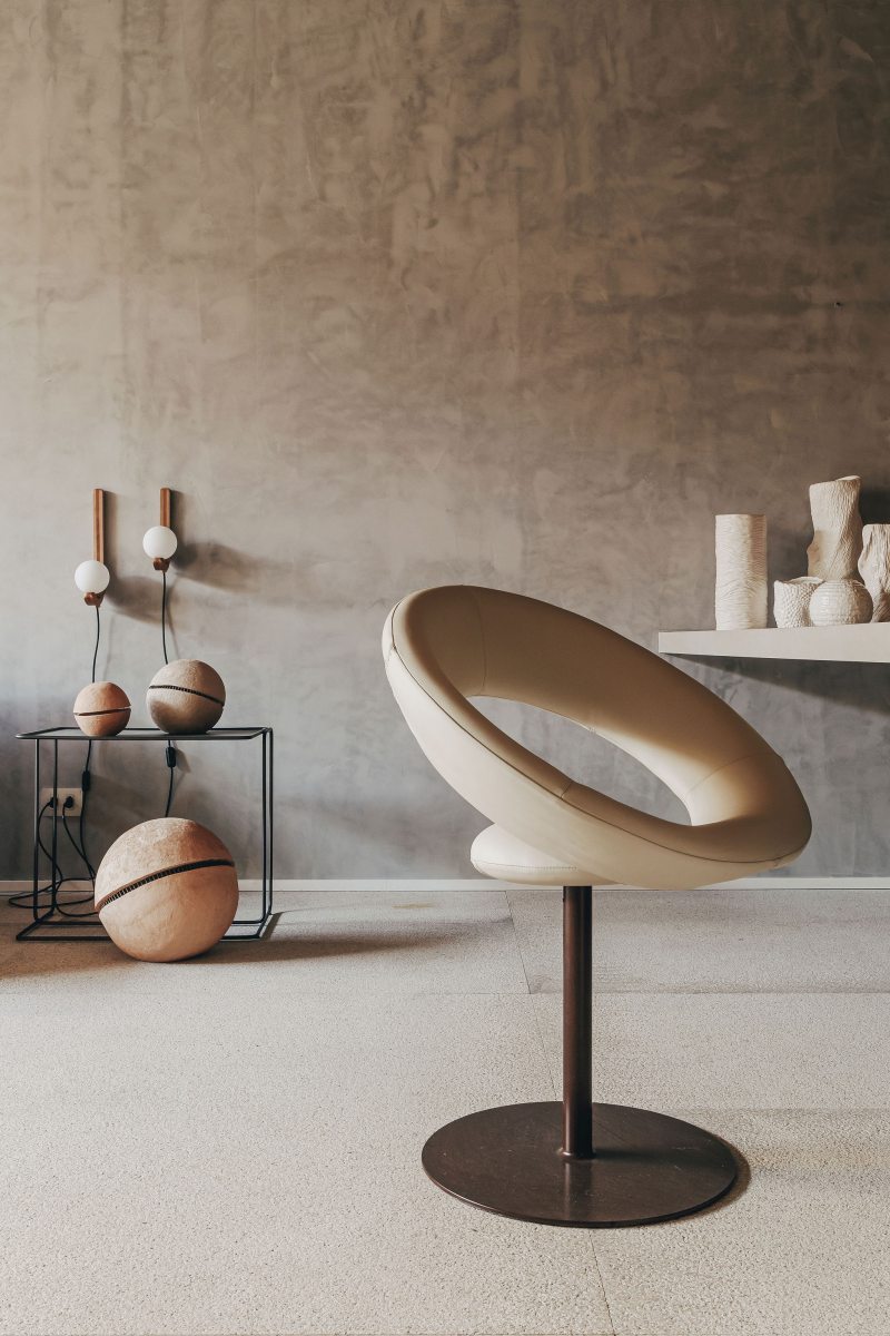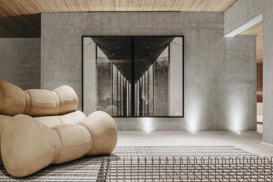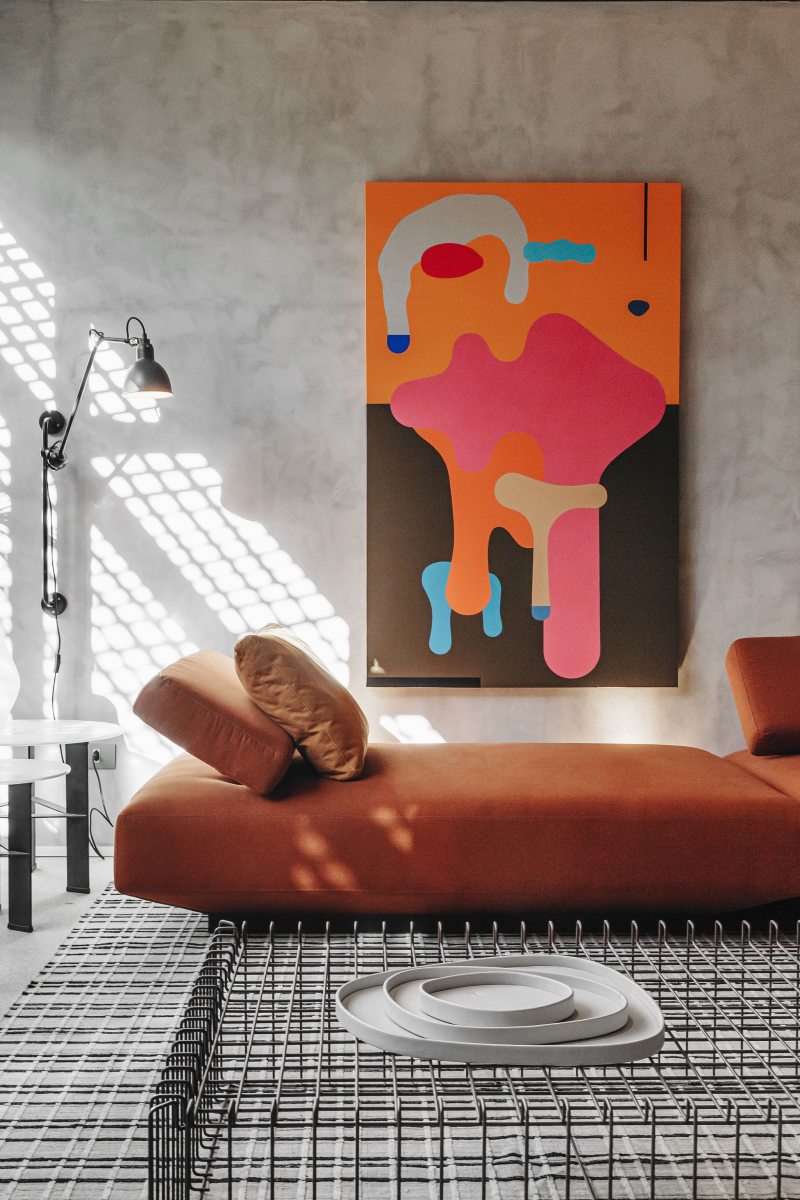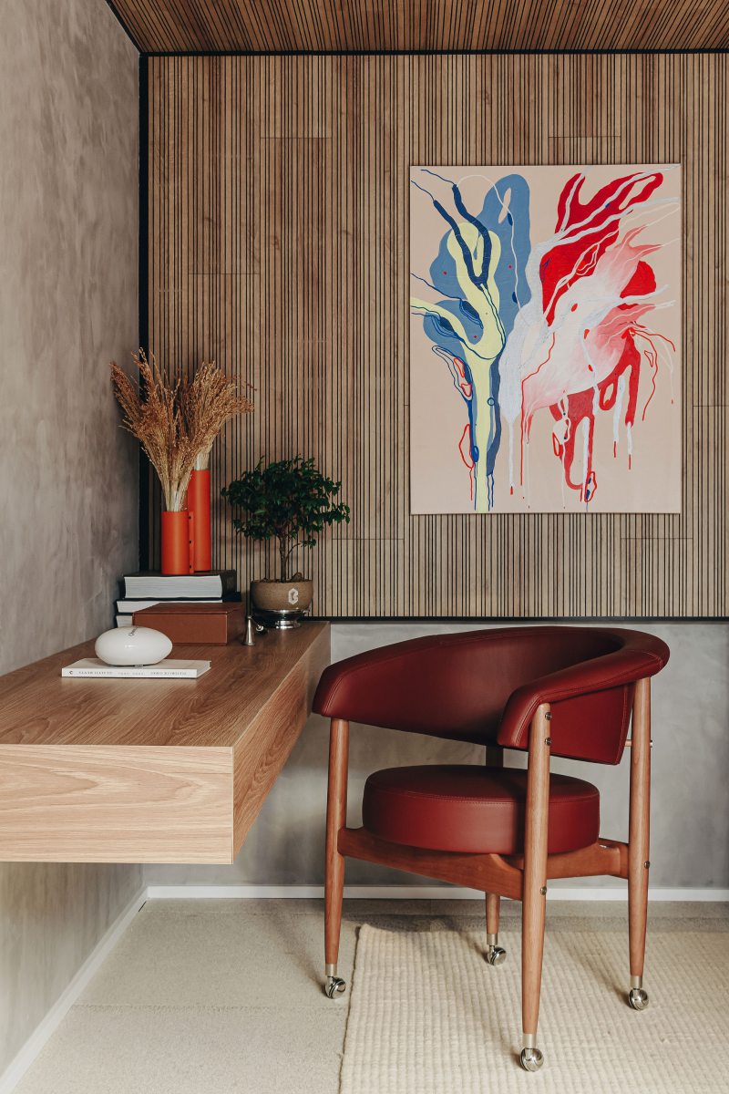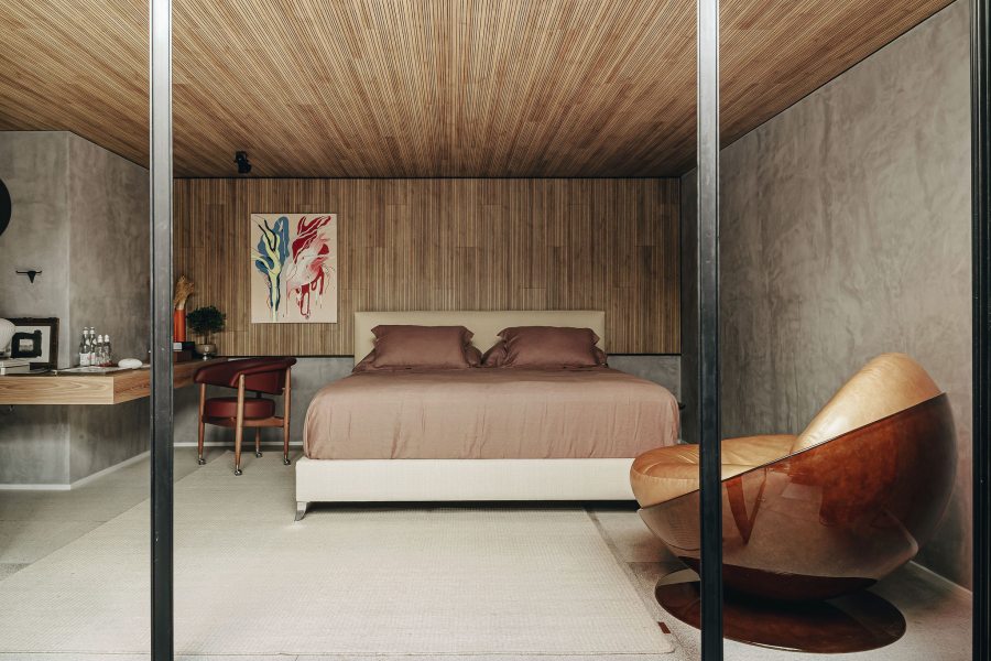 Assinatura do Studio, a curadoria de objetos decorativos e obras de arte não poderia faltar no projeto, trazendo pontos de cor que contrastam com o efeito de cimento queimado das paredes e o piso de granito apicoado e escovado, da PR Grupo Paraná. Vale o destaque para os objetos garimpados na Oda Design, que contextualizam a essência do Loft. No social, o momento de leitura fica ainda mais convidativo com a poltrona Fardos, do atelier Ricardo Fasanello – Momenttum loja. Os ambientes ganham um toque extra de conforto com a tapeçaria artesanal da Botteh Handmade Rugs, que também auxiliam a delimitar os espaços.