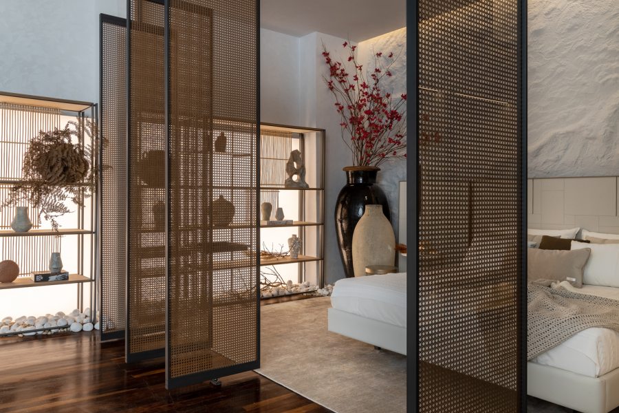 Para separar, sem cobrir, Cinandra apostou nos painéis pivotantes da linha Opus, um lançamento da Cinex Arch. Os perfis com acabamento Nero Industriale/ Vestirsi Coloniale Noce tem nuances cintilantes e receberam vidro e aplicação de textura em palha.