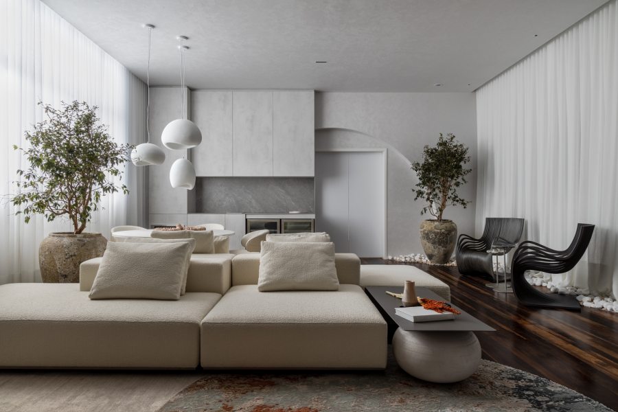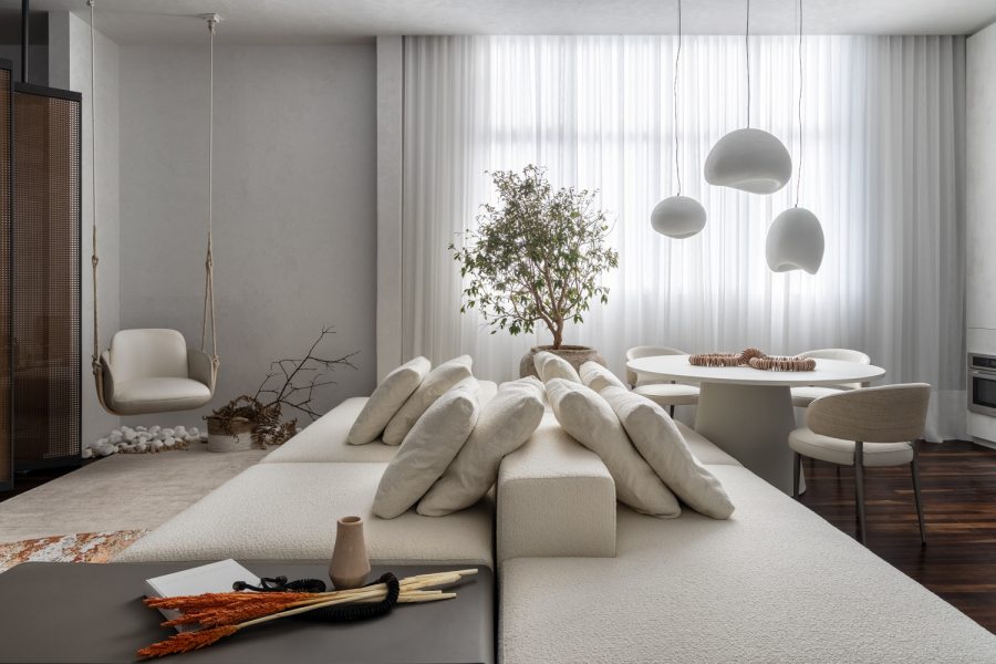 Na área de estar e jantar, Cinandra apostou em um mobiliário confortável e convidativo. Os módulos Lounge tem a versatilidade de receber várias pessoas, ou acomodar os moradores com máximo conforto. O toque de design fica para as cadeiras Pipo, um dos móveis mais emblemáticos e desejados do acervo Artefacto. Assinada pelo Studio Piegatto, a Pipo tem linhas sinuosas e orgânicas, que resultam num objeto funcional, gráfico e artístico.