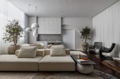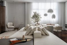 Para dar unidade ao espaço, a arquiteta optou pela textura Velvet. O efeito da pintura se confunde com a marcenaria exclusiva da Exata Interiores e dá a sensação de que móveis, teto e paredes estão integrados. Destaque, ainda, para a adega e frigobar da Elettromec, um convite para apreciar vinhos frescos e dividir bons momentos. Para que os visitantes se sintam inspirados e relaxados, a arquiteta propôs uma iluminação cênica, com painéis da Dress All e luminárias Everglow, da Everlight, que oferecem conforto óptico, qualidade de luz e efeitos destacados. Para finalizar, as cortinas da Uniflex permitem entrada de luz natural na medida certa. "Acho importante dizer que os tapetes da Botteh e os vasos da Organne contribuíram de forma exata para deixar o loft com ares de praia", completa Cinandra.