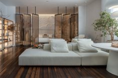 O ambiente de 72 m2, setorizado em áreas de dormir, estar e jantar, marca a estréia da profissional na mostra de arquitetura e décor. O ponto de partida de todo o projeto foi a parede texturizada - uma clara alusão à arquitetura grega - que tem como característica marcante o uso de pedras vulcânicas e cal em suas construções. É abaixo dessa parede que Cinandra apresenta uma área de dormir contemporânea e elegante protagonizada pela cabeceira Piet, da Artefacto, em dourado e couro natural. "Minha proposta foi misturar texturas e sensações com elementos contemporâneos de design e alto padrão. Todo o mobiliário aqui é Artefacto", conta Cinandra.