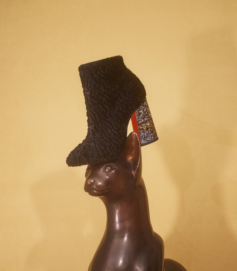 O toque de Christian também transformou sapatos em suas próprias categorias de arte, através do uso de materiais que reproduzem elementos naturais. As botas Hilconico possuem um tecido de pelúcia que lembra astracã, finalizados com efeitos que imitam mármore, osso ou ouro nos saltos.