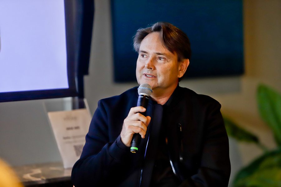 O futuro do conforto residencial foi tema do talk “Inteligência Artificial e o Novo Luxo — Tecnologia, Comportamento e Experiência”, apresentado em Curitiba. Conduzido pelo cientista de dados Marcello Nicolielo, o encontro destacou o trabalho da SmartLy, em parceria com a HotFloor, na aplicação de inteligência artificial adaptativa em lares de alto padrão. Na foto, o engenheiro e fundador Euclides Ciruelos, mestre em sustentabilidade, mentor da SmartLy Home. Foto Antonio More.