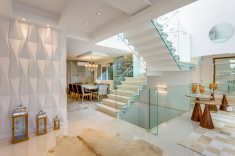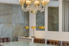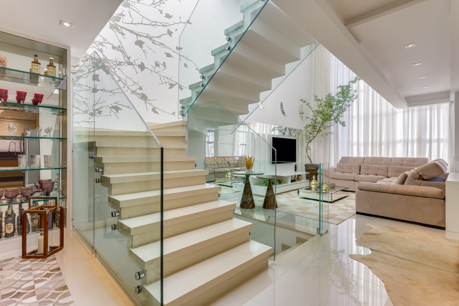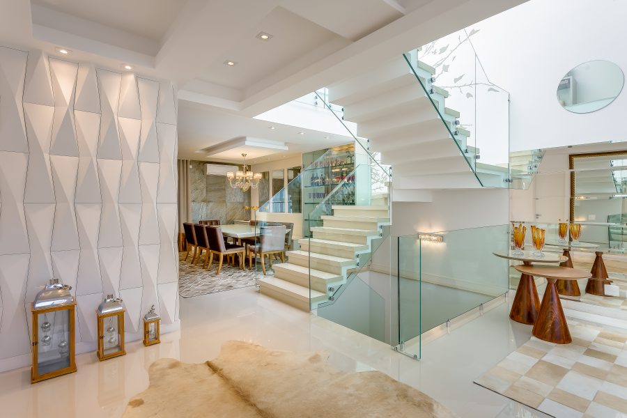 Nesta residência de 650m² os ambientes são sofisticados e foram divididos em três pavimentos. O design é sólido com cenários bem iluminados que se unem aos revestimentos.