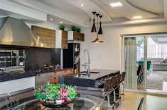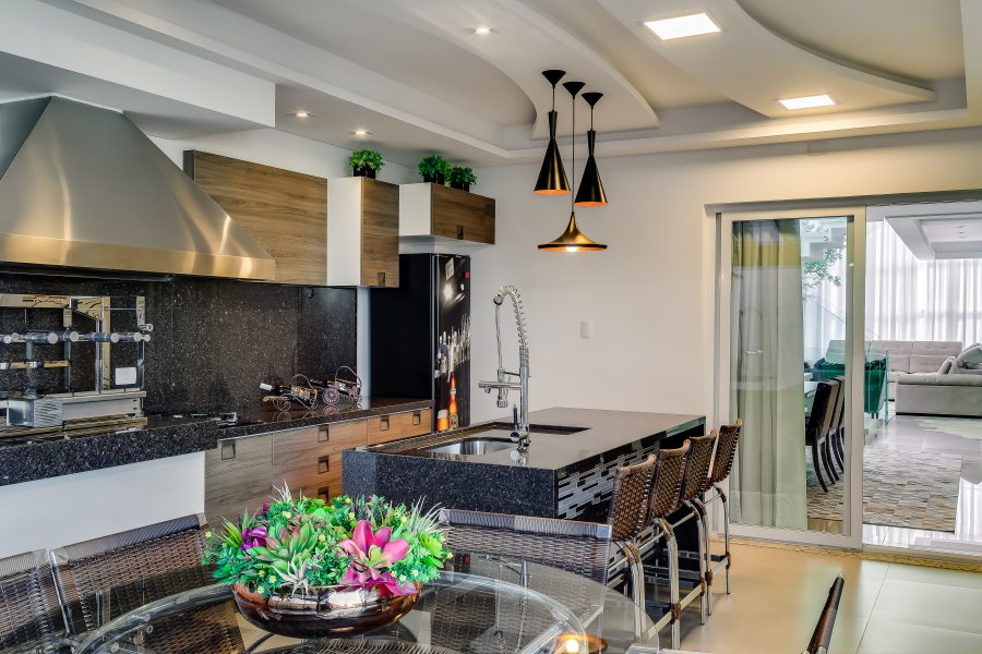 A designer consegue diferencias o estilo decorativo que engloba a iluminação mantendo o equilíbrio. A cozinha (Criativa Dell Ano) demonstra personalidade com o pendente moderno e revestimento Decortiles (Pastilhart).