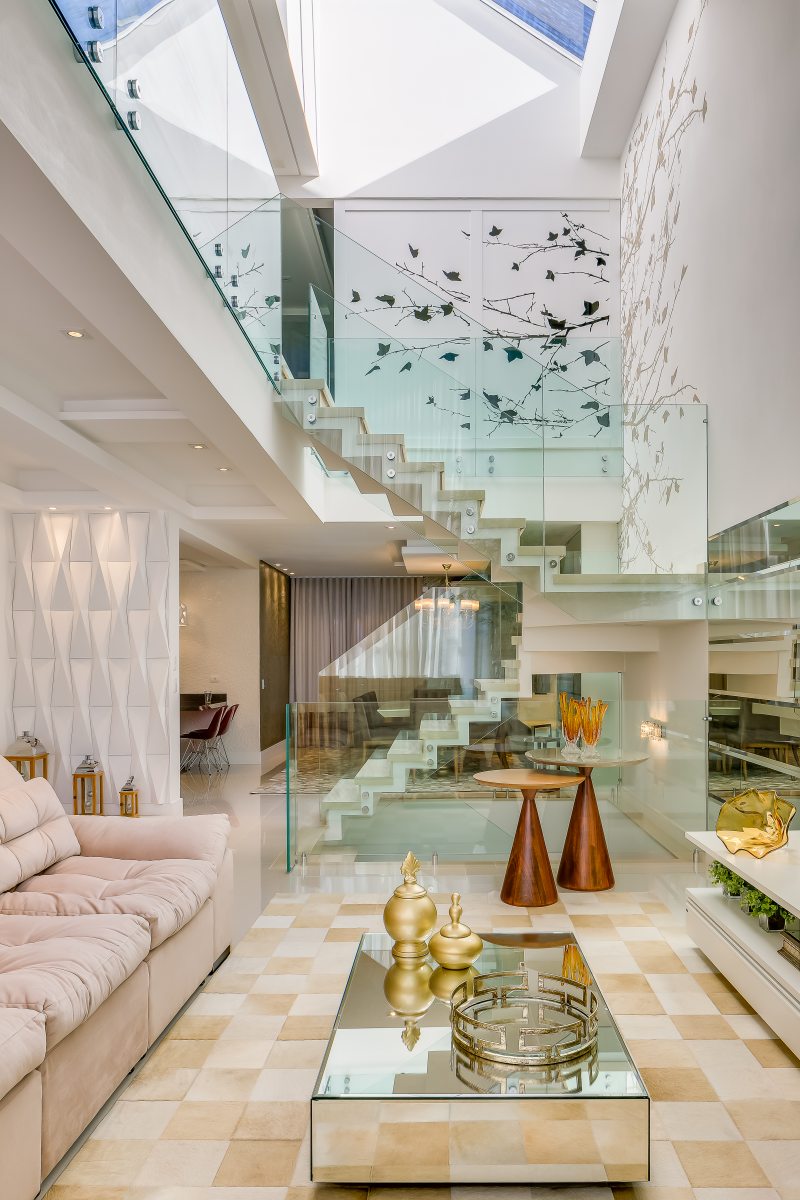 No térreo, o pé-direito alto do estar, com TV e itens decorativos, e os acabamentos das paredes com motivos geométricos e de aspecto brilhante.
