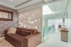 Para a divisão das salas, um desenho diferenciado no gesso em cada área. A escada é centralizada e possui fitas de LED nos degraus, em que foi reunido os trabalhos de dois artistas plásticos: Hicaro Pita e Marilene Ropelato.